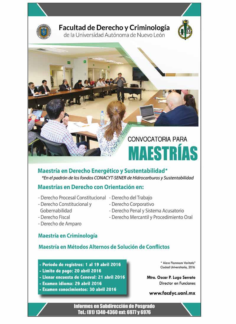 EQUIDAD ANÁLISIS JURÍDICO Y POLÍTICO, Revista Mensual. ABRIL 2016. Editor responsable: RAÚL CARRIZALES GONZÁLEZ. Certificado de Reserva de Derechos al Uso Exclusivo del Título EQUIDAD ANÁLISIS JURÍDICO Y POLÍTICO No. 04-2012-041914200700-102, otorgado por el Instituto Nacional del Derecho de Autor, de fecha 19 de abril del 2012 (vigente). Número de Certificado de Licitud de Título y Contenido 16268, expedido por la Comisión Calificadora de Publicaciones y Revistas Ilustradas de la Secretaría de Gobernación, de fecha 14 de Julio del 2014. EQUIDAD, es Marca Registrada con el número 1374245, de fecha 7 de Junio del 2013, expedido por el Instituto Mexicano de la Propiedad Industrial. Domicilio de la publicación: Platón Sánchez 711 Norte, Col. Centro, Monterrey, N. L. C.P. 64000. Impreso por Facsímil Arte Gráfico, S.A. de C.V., con domicilio en Félix U. Gómez No. 2818 Norte. Col. Cementos, Monterrey, N. L. C.P. 64520. Distribuidor: RAÚL CARRIZALES
