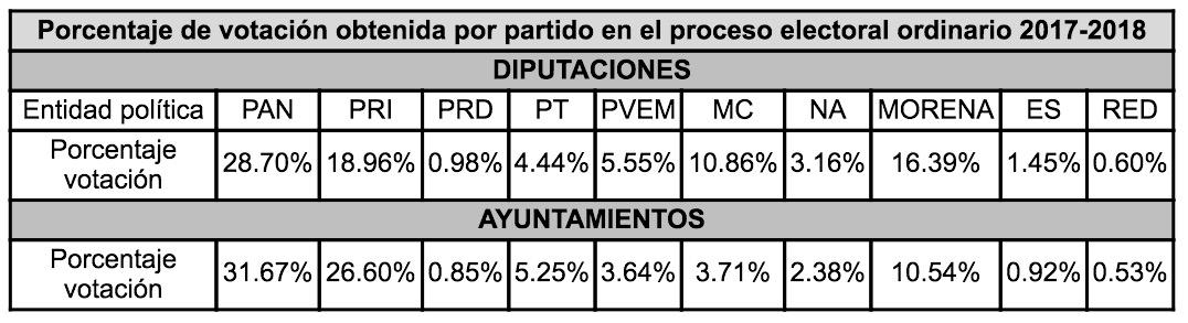 Por otro lado, las entidades que no obtuvieron la votación mínima requerida son: PRD; ES y RED.