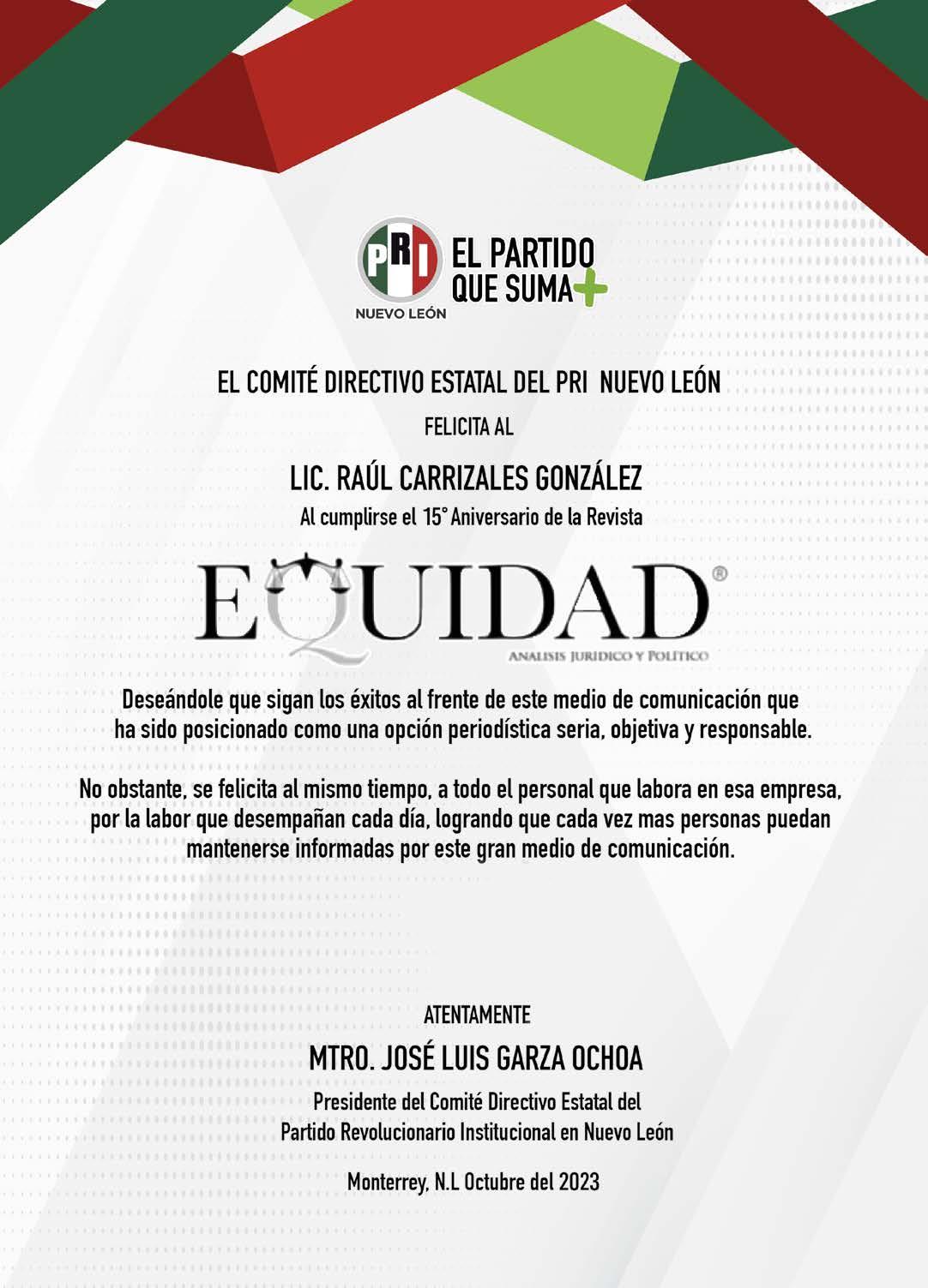 EQUIDAD ANÁLISIS JURÍDICO Y POLÍTICO, Revista Mensual. OCTUBRE 2023. Editor responsable: RAÚL CARRIZALES GONZÁLEZ. Certificado de Reserva de Derechos al Uso Exclusivo del Título EQUIDAD ANÁLISIS JURÍDICO Y POLÍTICO No. 04-2012-041914200700-102, otorgado por el Instituto Nacional del Derecho de Autor, de fecha 19 de abril del 2012 (vigente). Número de Certificado de Licitud y Contenido 16268, expedido por la Comisión Calificadora de Publicaciones y Revistas Ilustradas de la Secretaría de Gobernación, de fecha 14 de Julio del 2014. EQUIDAD, es Marca Registrada con el número 1374245, de fecha 7 de Junio del 2013, expedido por el Instituto Mexicano de la Propiedad Industrial. Domicilio de la publicación: Vasco de Gama No. 305, Col. Treviño, Monterrey, Nuevo León. C. P. 64570. Impreso por Facsímil Arte Gráfico, S.A. de C.V., con domicilio en Félix U. Gómez No. 2818 Norte, Col. Cementos, Monterrey, Nuevo León. C.P. 64520. Distribuidor: RAÚL CARRIZALES GONZÁLEZ (mismo domicilio de la publicación). Tels. 81-1771-5141 y 811-544-96-46. Correo: ajc_carrizales@msn.com www.revista-equidad.com