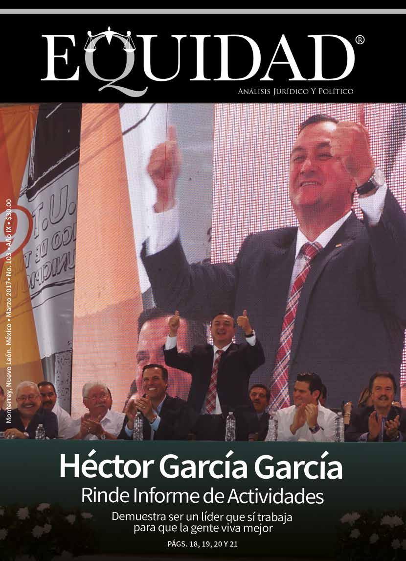 EQUIDAD ANÁLISIS JURÍDICO Y POLÍTICO, Revista Mensual. MARZO 2017. Editor responsable: RAÚL CARRIZALES GONZÁLEZ. Certificado de Reserva de Derechos al Uso Exclusivo del Título EQUIDAD ANÁLISIS JURÍDICO Y POLÍTICO No. 04-2012-041914200700-102, otorgado por el Instituto Nacional del Derecho de Autor, de fecha 19 de abril del 2012 (vigente). Número de Certificado de Licitud de Título y Contenido 16268, expedido por la Comisión Calificadora de Publicaciones y Revistas Ilustradas de la Secretaría de Gobernación, de fecha 14 de Julio del 2014. EQUIDAD, es Marca Registrada con el número 1374245, de fecha 7 de Junio del 2013, expedido por el Instituto Mexicano de la Propiedad Industrial. Domicilio de la publicación: Platón Sánchez 711 Norte, Col. Centro, Monterrey, N. L. C.P. 64000. Impreso por Facsímil Arte Gráfico, S.A. de C.V., con domicilio en Félix U. Gómez No. 2818 Norte. Col. Cementos, Monterrey, N. L. C.P. 64520.