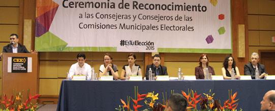 Por la excelente labor desempeñada al frente de las 51 Comisiones Municipales Electorales del Estado en el proceso electoral 2014-2015, la Comisión Estatal Electoral reconoció a los 204 ciudadanos integrantes de estos órganos, en una ceremonia realizada en un hotel de la localidad, el 3 de octubre. En el presídium del evento participaron el Consejero Presidente de la CEE, Mario Alberto Garza; las Consejeras Miriam Hinojosa, Sara Lozano, Claudia Patricia de la Garza, y Sofía Velasco; los Consejeros Javier Garza y Gilberto Pablo De Hoyos; así como el Secretario Ejecutivo del organismo, Héctor García.