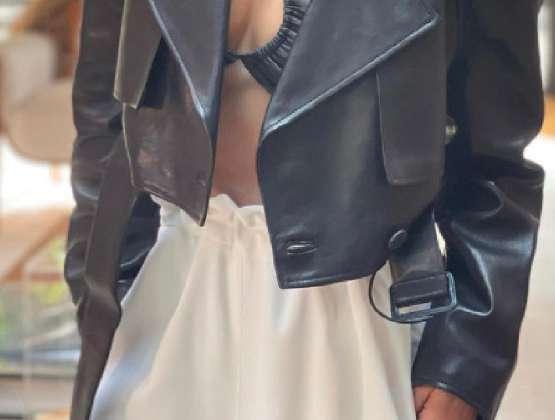 Jennifer Lopez apostó por combinar unos pantalones de cintura alta confeccionados en una tela suave y brillante en blanco con resorte elástico en la parte superior, de la manera más desenfadada posible: con un top negro de vinilo con acabado mate y tirantes cruzados. A juego lució una chaqueta de motociclista del mismo tono que iba recortada.