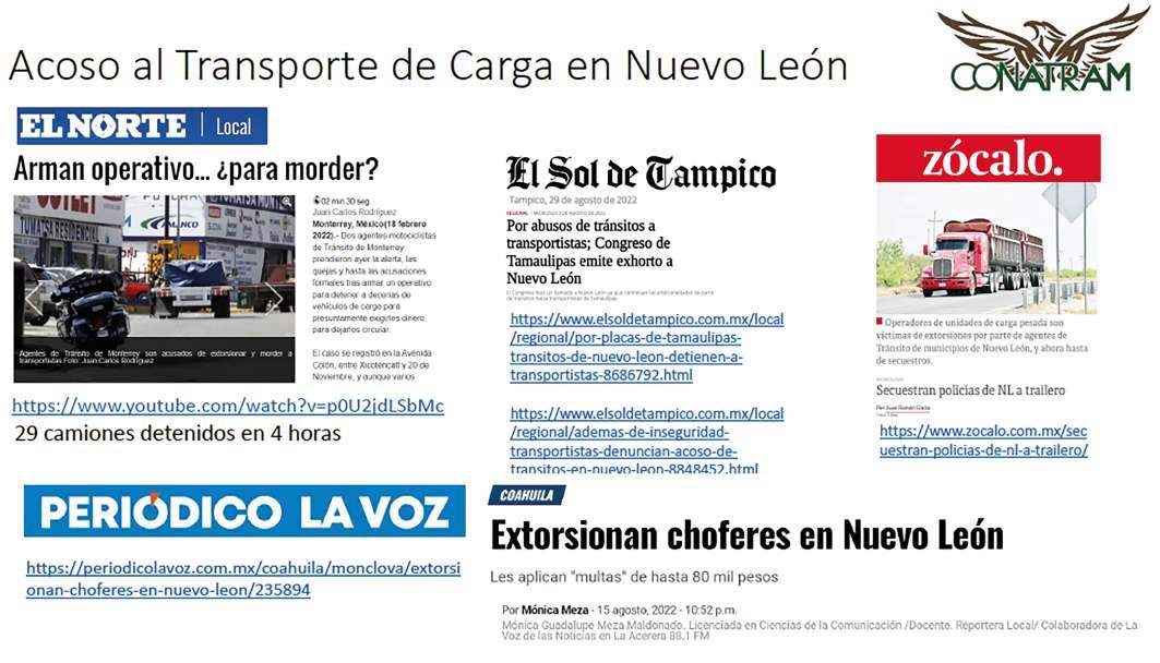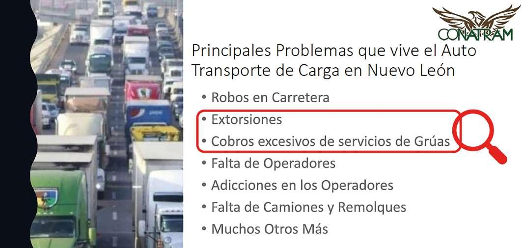 La reunión tenía un tema único, “La Extorsión”, algunos temas que constantemente Conatram ha mencionado, como lo son los abusos de autoridad, cobros indebidos de empresas de grúas, pensiones y salvamento de la policía municipal de Nuevo León, especialmente la zona metropolitana, en la que los transportistas comentan que los alcaldes están involucrados a tal grado que los policías municipales, detienen al transporte, con “X” pretexto pidiéndole sus documentos, si algo encuentra mal, de ahí se agarra y si anda bien, le inventan para obligarlo a sacarle una cantidad de dinero.