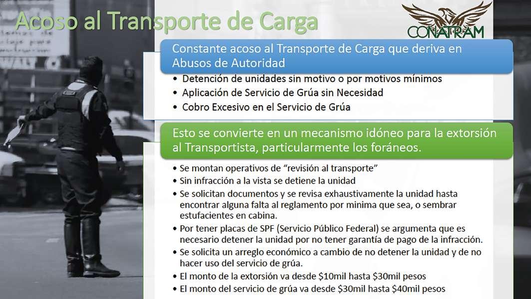 “Exigen, como ustedes escucharon a mis compañeros, grandes sumas de dinero y se llevan con grúas a los corralones a los tráilers, para luego terminar el abuso y extorsión con 30 o 40 mil pesos”.
