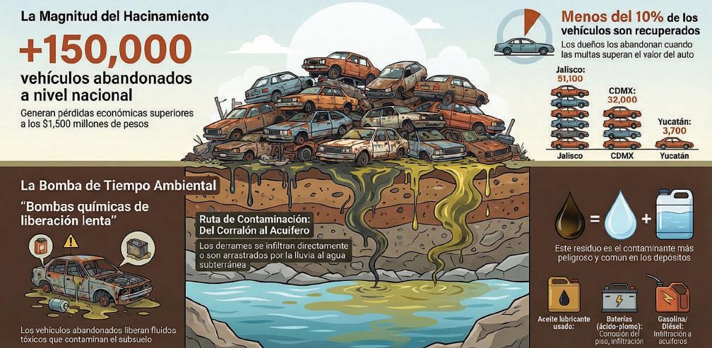 El hacinamiento de vehículos en los depósitos de México ha trascendido el caos administrativo para convertirse en una crisis ambiental silenciosa. Con un inventario que supera las 150 mil unidades abandonadas en corralones de todo el país, estos espacios operan hoy como focos de contaminación severa, operando bajo un marco legal rebasado y una infraestructura nula para el manejo de residuos peligrosos.