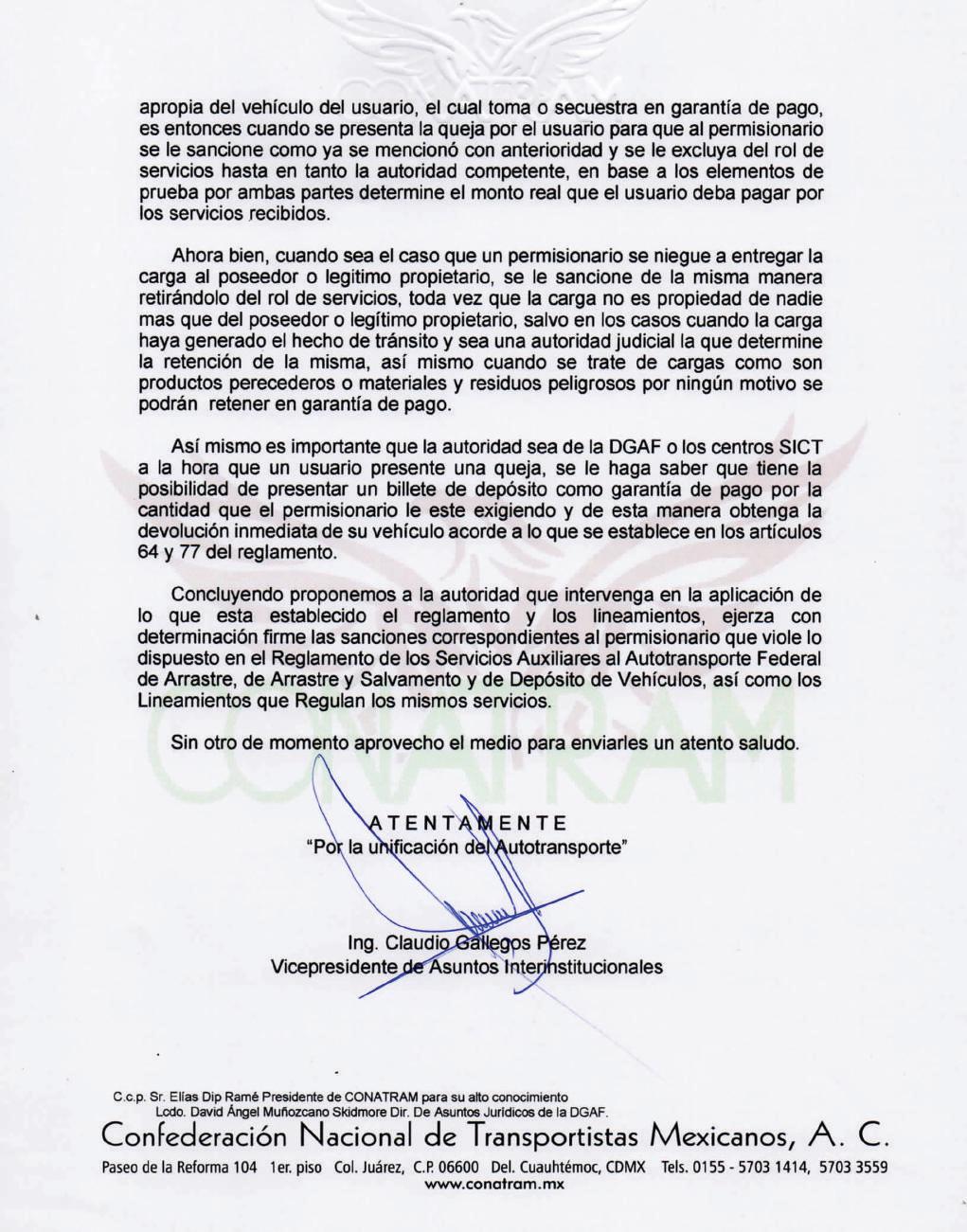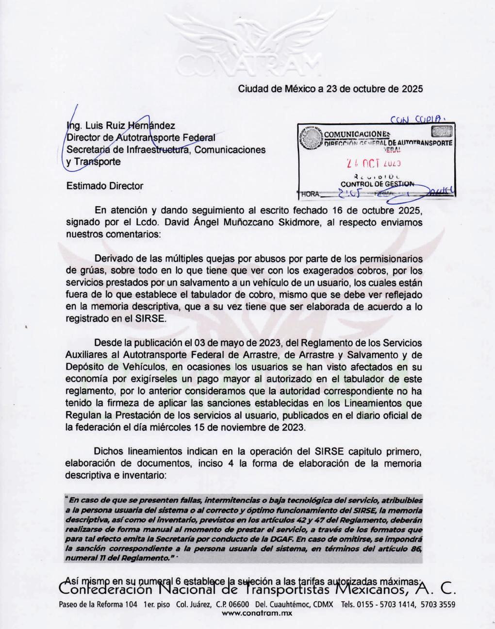 “El autotransporte no pide privilegios ni excepciones; exige que la ley se aplique con legalidad, transparencia y sin abusos. Cuando la discrecionalidad de un funcionario se normaliza, se vulnera el libre tránsito y se afecta directamente a la competitividad del país”, afirmó el legislador. “Ordenar el servicio de grúas y corralones no debe ser un tema de debate político, es una obligación de Estado y una urgencia económica”.