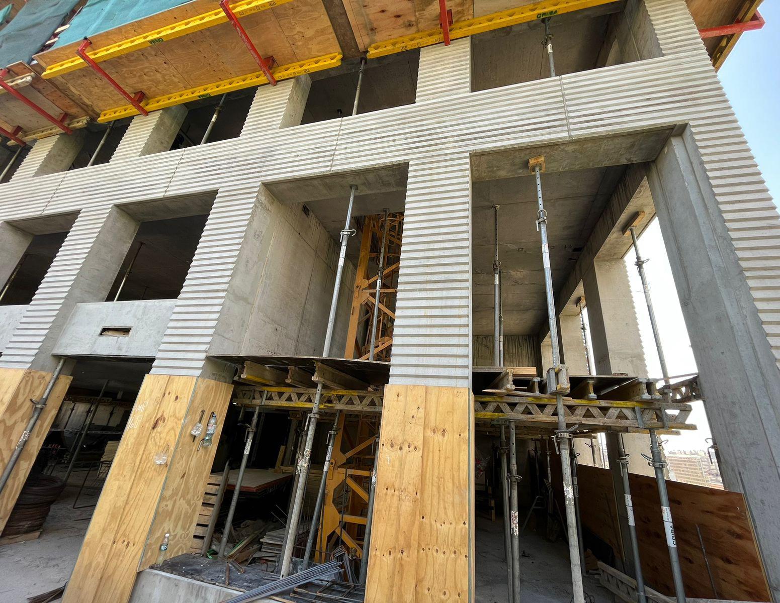 DETALLES DEL EDIFICIO QUE DESARROLLA CONSULTATIO Y CONSTRUYE CRIBA EN EL BAJO PORTEÑO. SU TERMINACIÓN SERÁ DE HORMIGÓN VISTO GRECADO. LA CONSTRUCTORA DISEÑÓ, PROYECTÓ Y REALIZÓ UN PROTOTIPO PREVIO Y SE ASESORÓ CON UN TECNÓLOGO DEL HORMIGÓN PARA SU EJECUCIÓN.