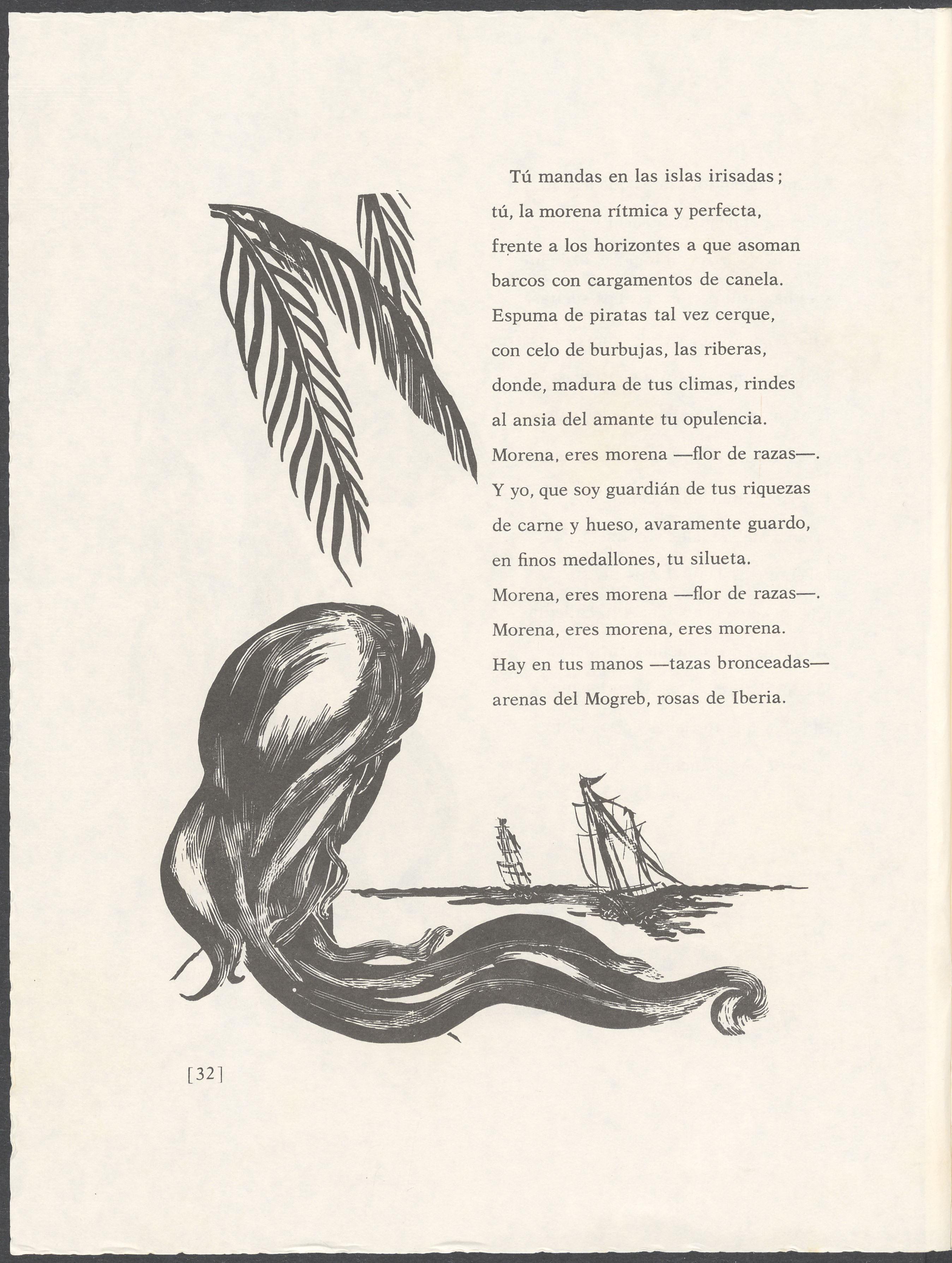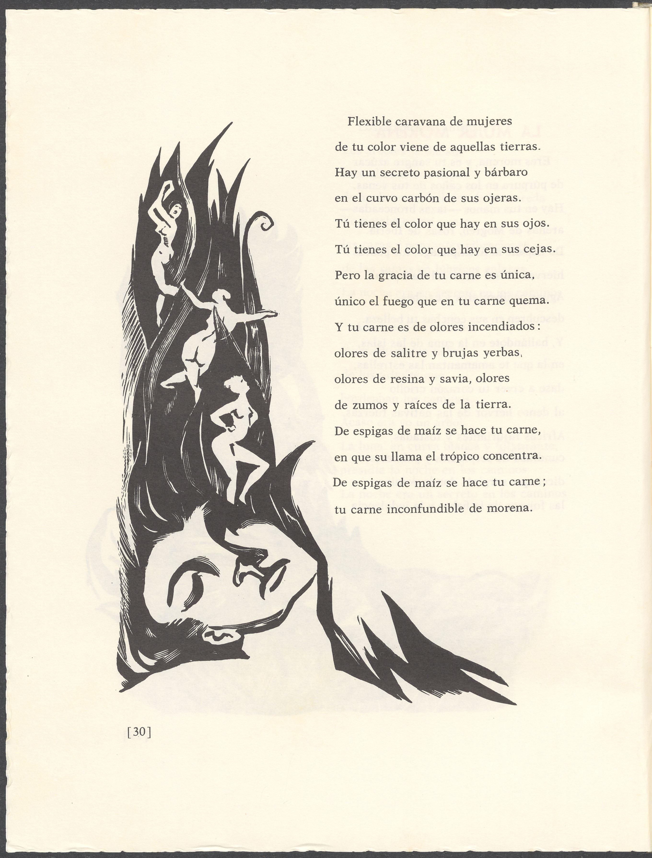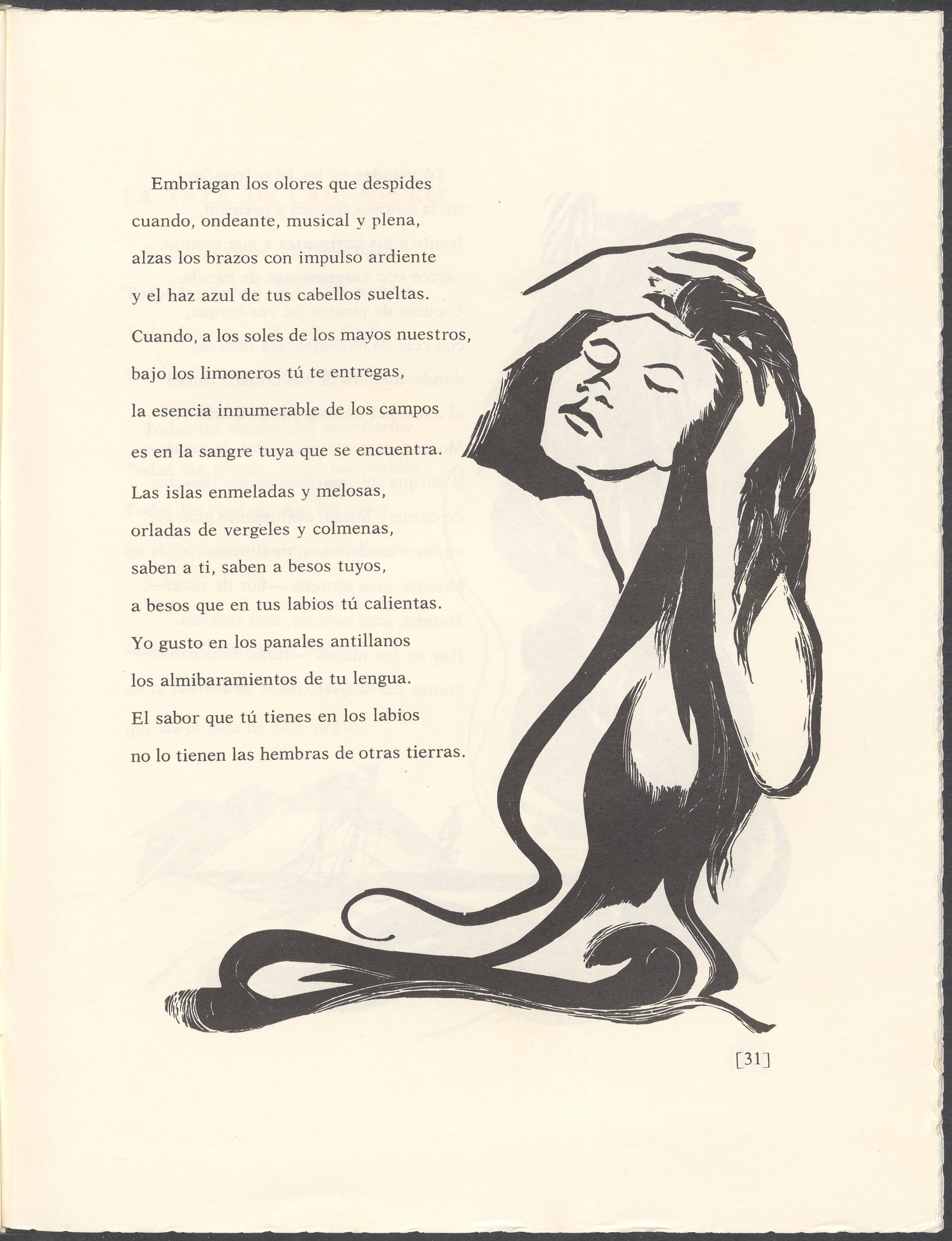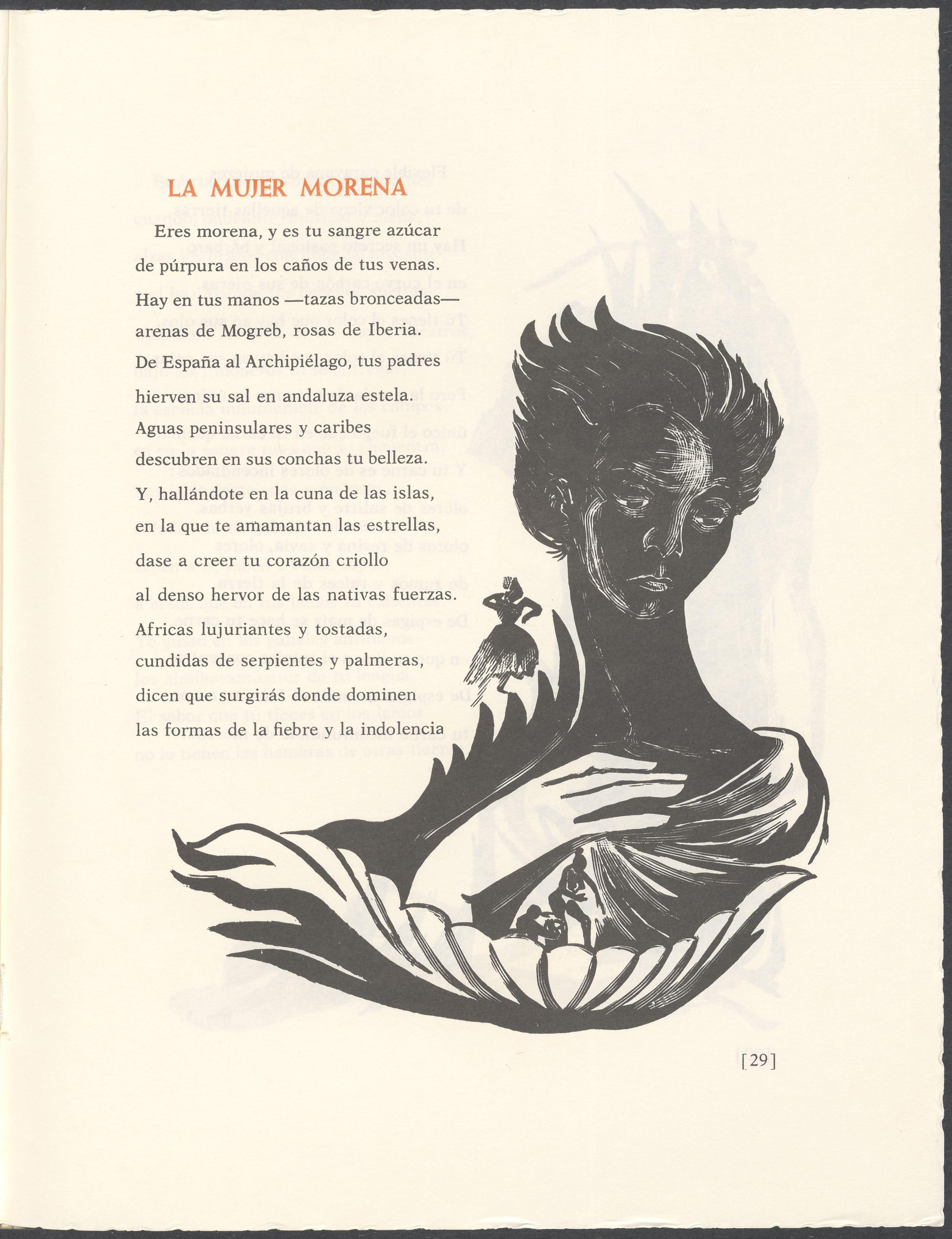 Eres morena, y es tu sangre azúcar de púrpura en los caños de tus venas. Hay en tus manos —tazas bronceadas— arenas de Mogreb, rosas de Iberia. De España al Archipiélago, tus padres hierven su sal en andaluza estela. Aguas peninsulares y caribes descubren en sus conchas tu belleza. Y, hallándote en la cuna de las islas, en la que te amamantan las estrellas, dase a creer tu corazón criollo al denso hervor de las nativas fuerzas. Africas lujuriantes y tostadas, cundidas de serpientes y palmeras, dicen que surgirás donde dominen las formas de la fiebre y la indolencia
