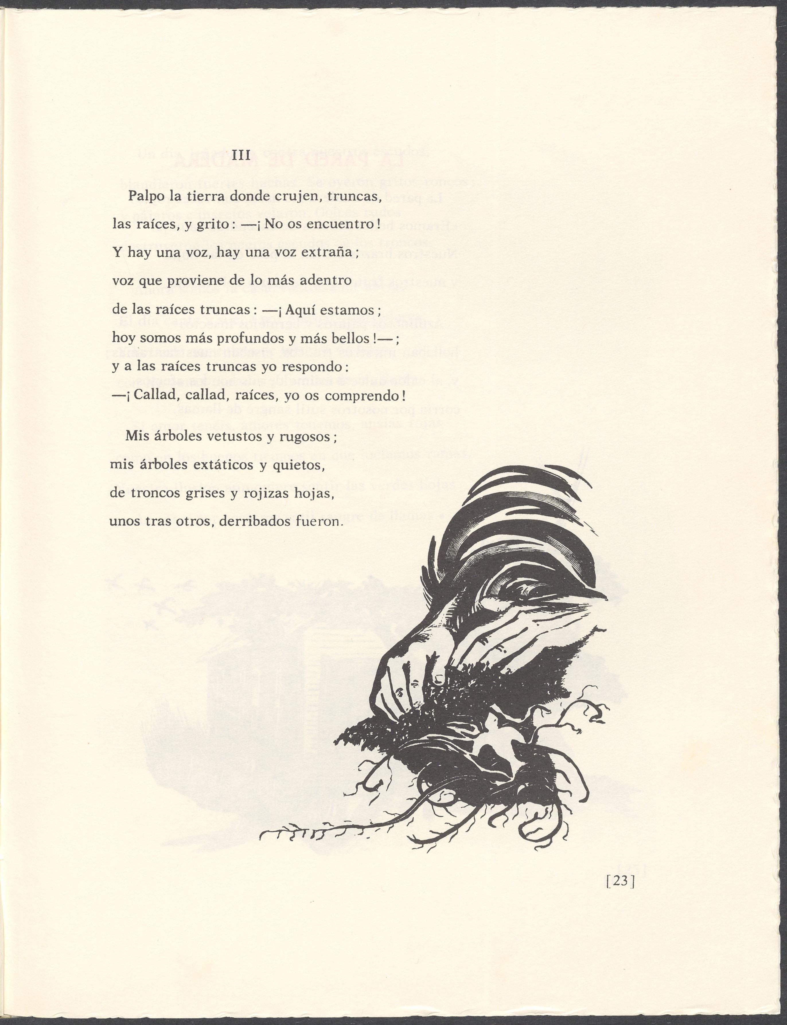 Y hay una voz, hay una voz extraña; voz que proviene de lo más adentro de las raíces truncas:—j; Aquí estamos hoy somos más profundos y más bellos !—; y a las raíces truncas yo respondo: —jCallad, callad, raíces, yo os comprendo!