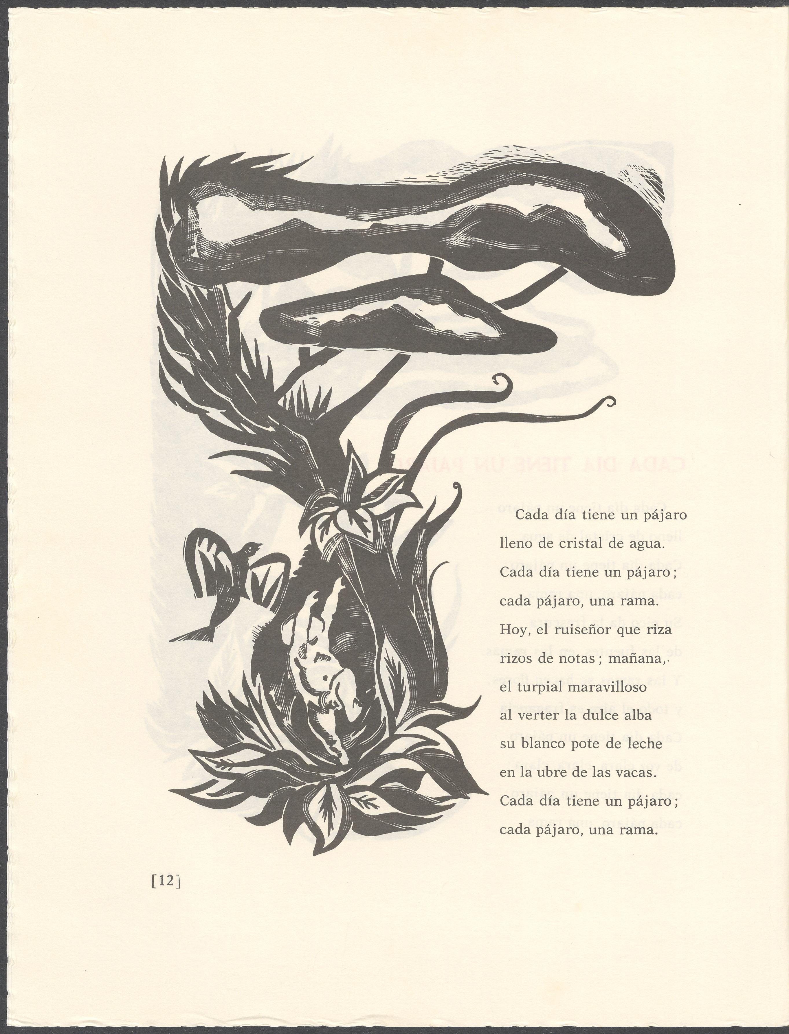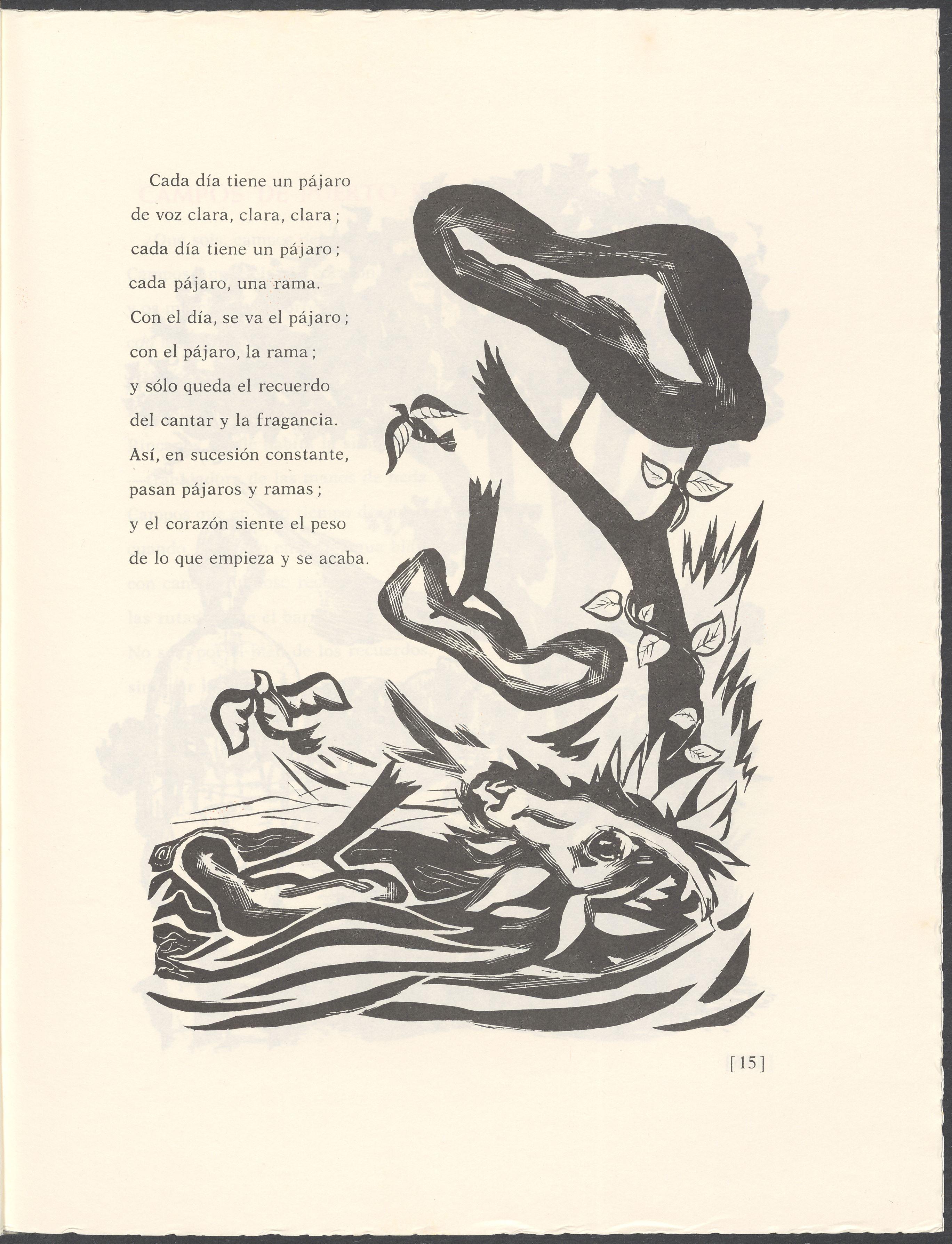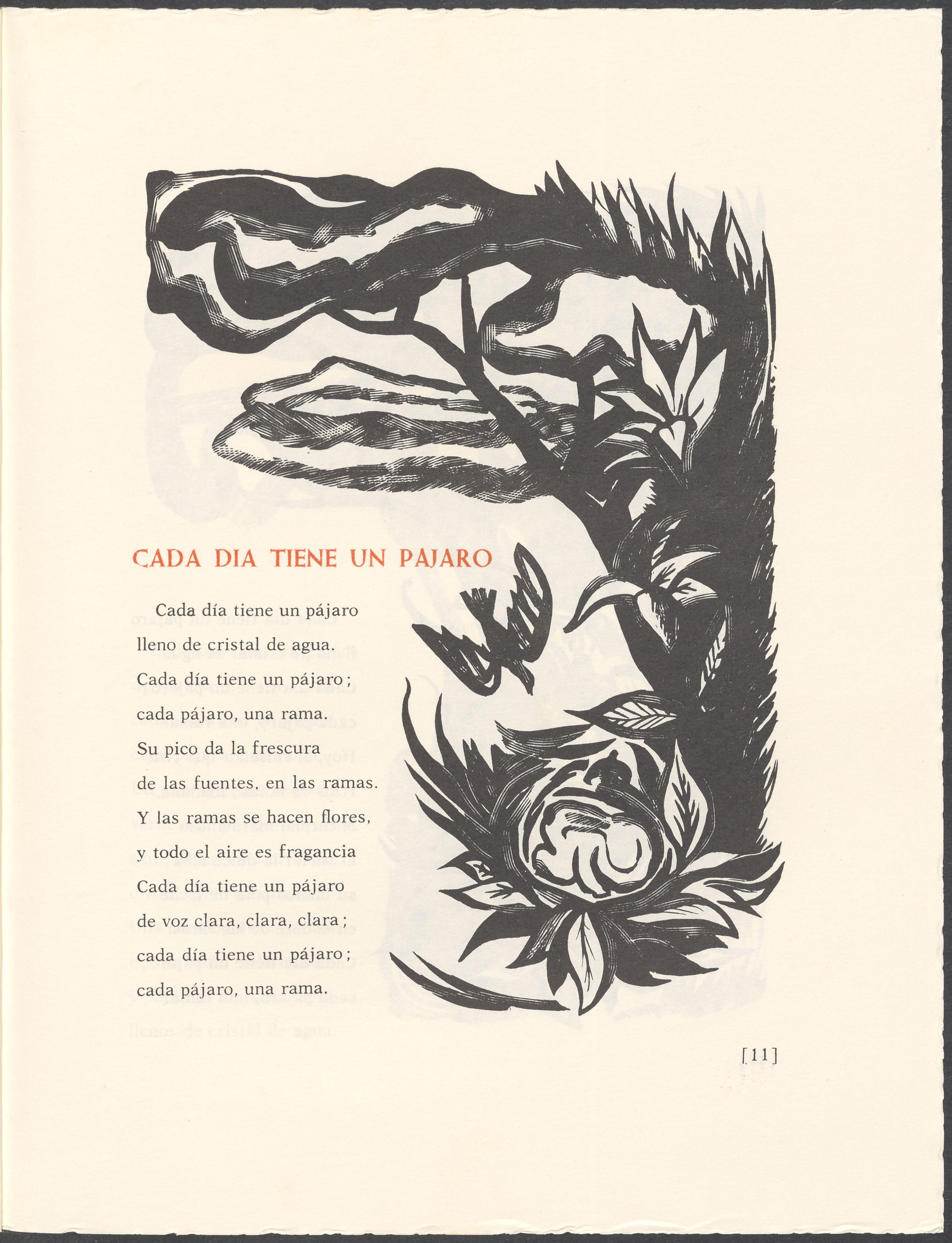 Cada día tiene un pájaro de voz clara, clara, clara. cada día tiene un pájaro; cada pájaro, una rama. Con el día, se va el pájaro; con el pájaro, la rama; y sólo queda el recuerdo del cantar y la fragancia.