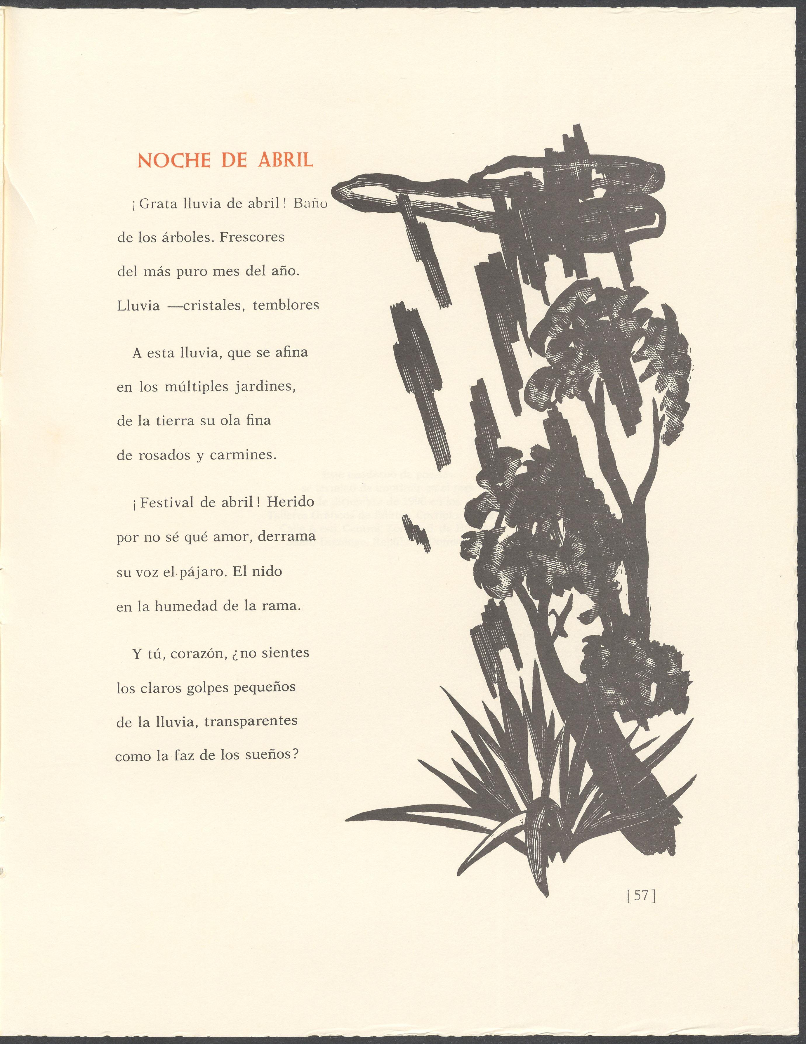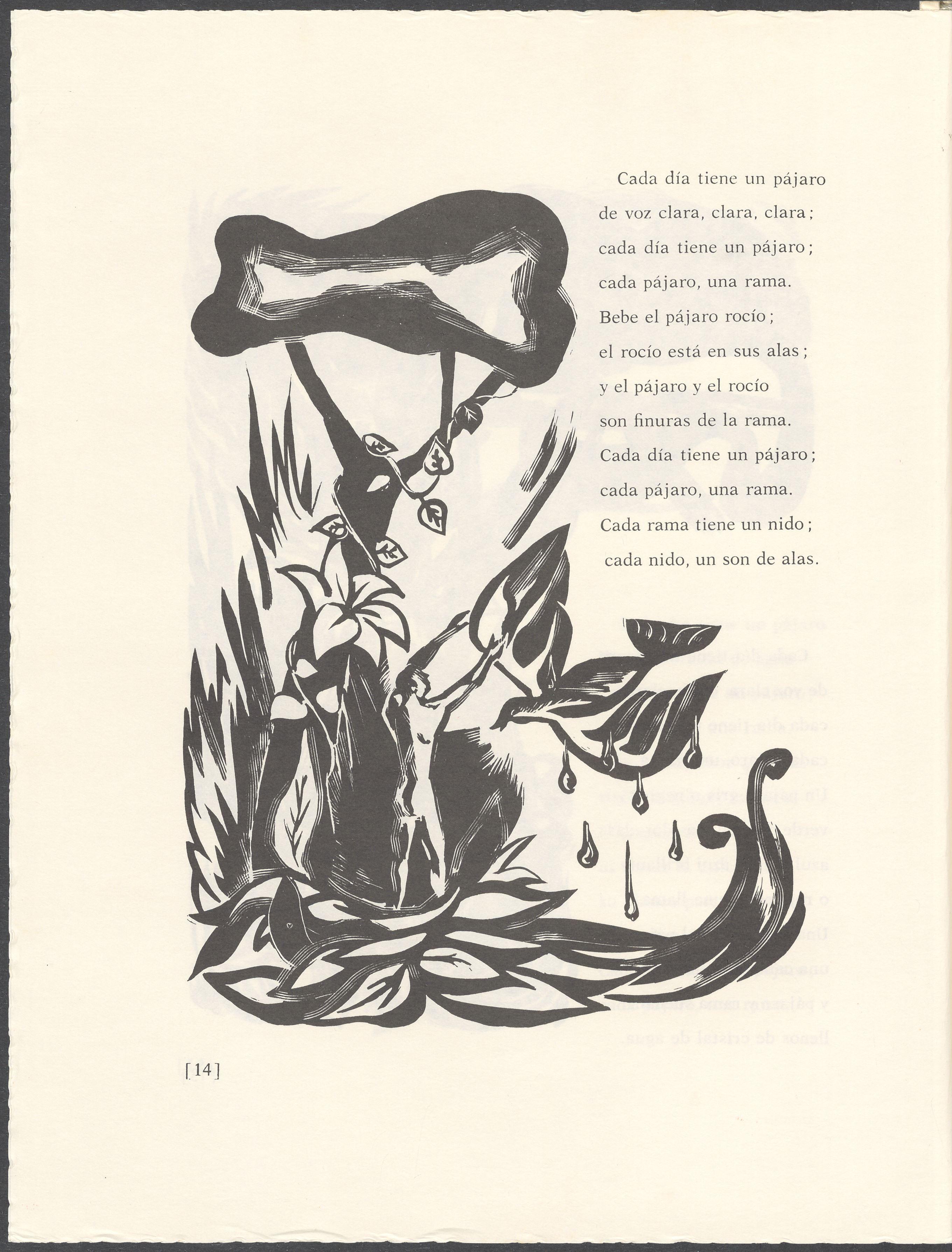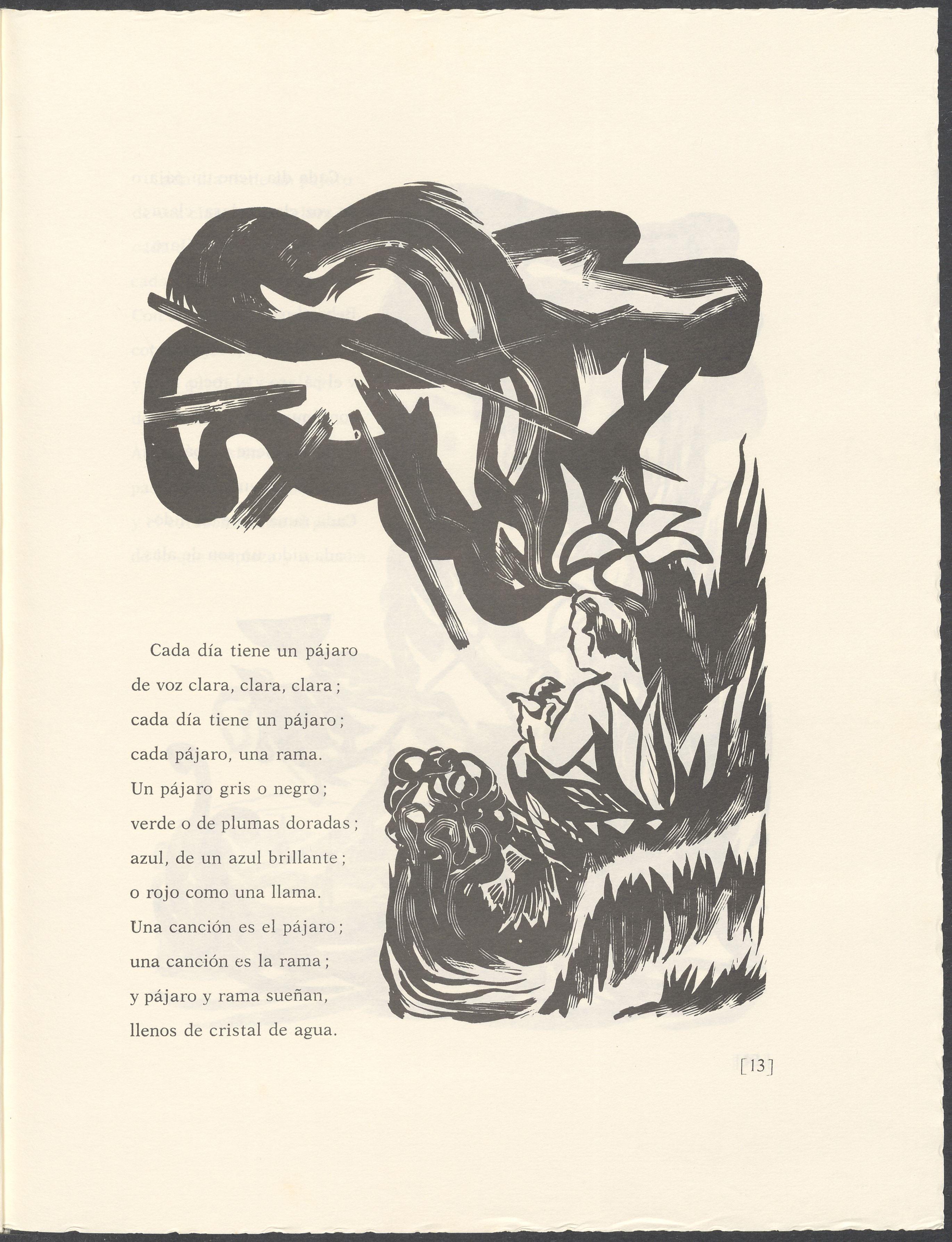 Cada día tiene un pájaro de voz clara, clara, clara. cada día tiene un pájaro; cada pájaro, una rama. Con el día, se va el pájaro; con el pájaro, la rama; y sólo queda el recuerdo del cantar y la fragancia.
