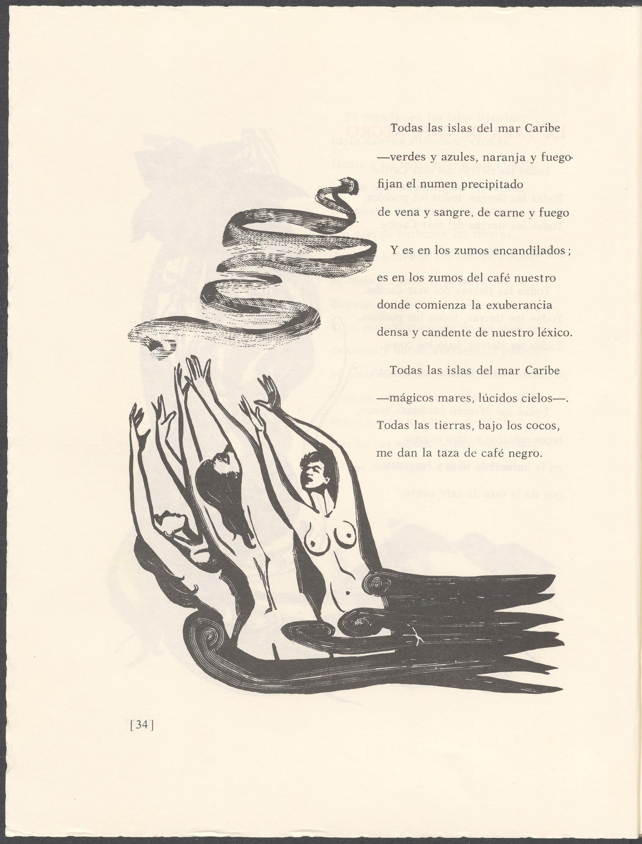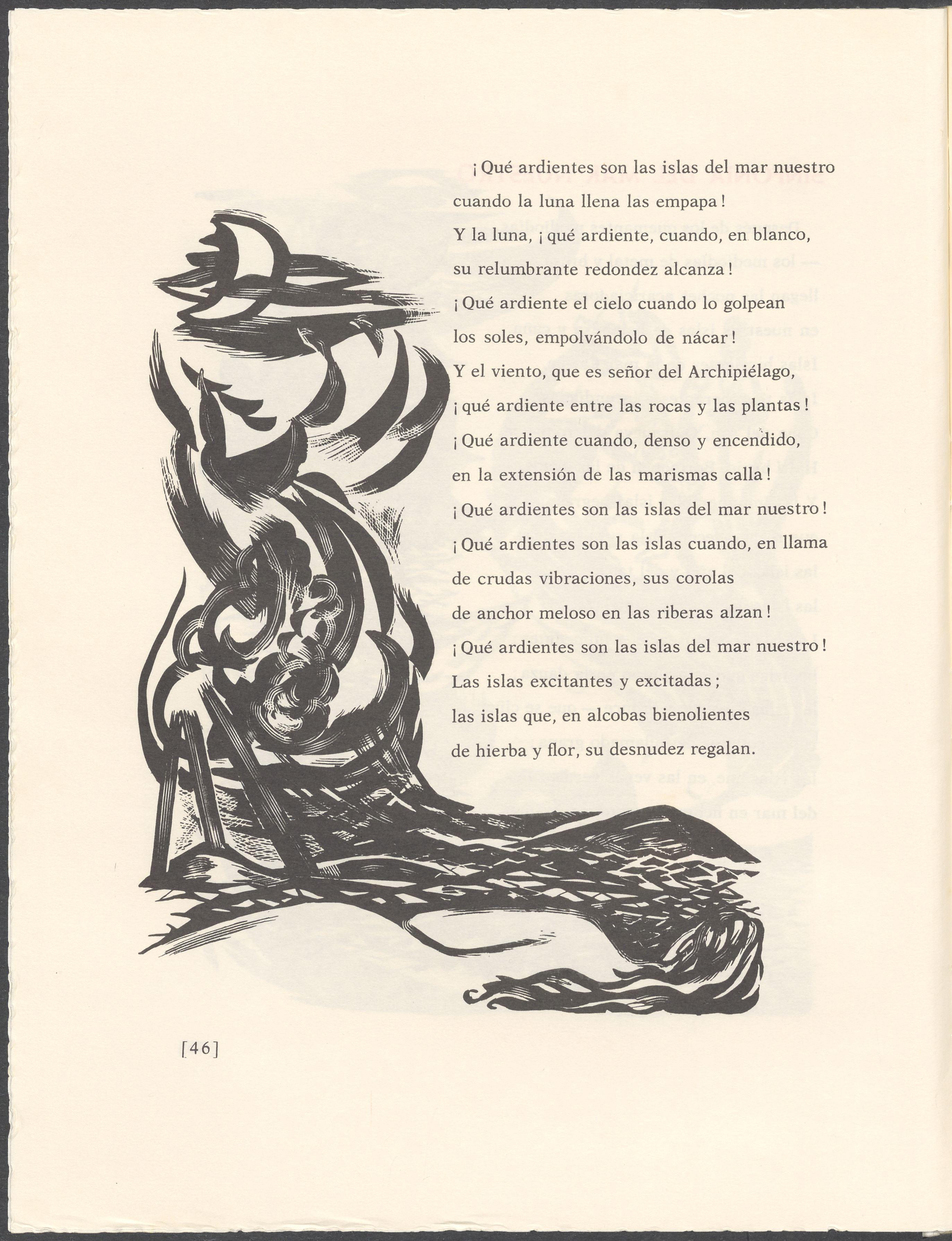 Y las innumerables islas negras que resplandecen en la ruta mágica: las islas del añil y del tabaco; las islas del cacao y la melaza. Las islas chamuscadas y humeantes ; las islas que se ayuntan en la danza; las islas — verde y bronce — que se ciñen rudos collares de inflamado grana; las islas que, en las venas verdeazules del mar en fiebre, su secreto entrañan.
