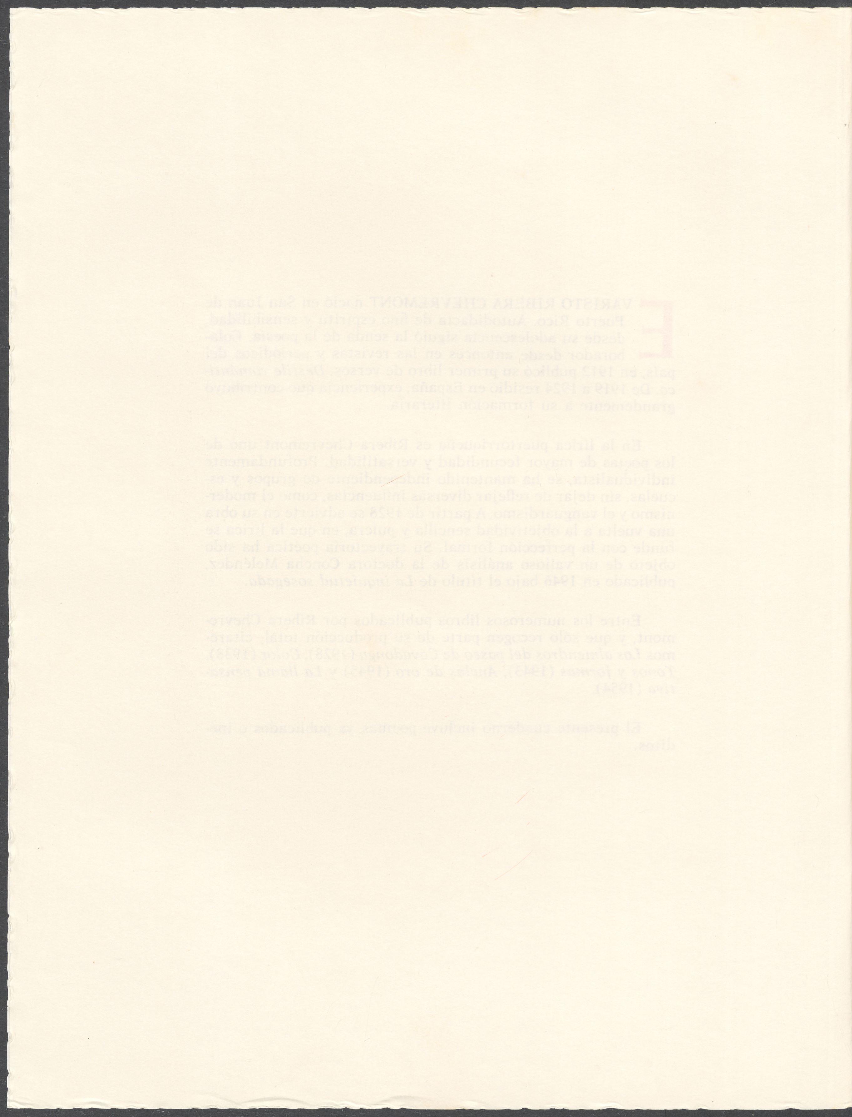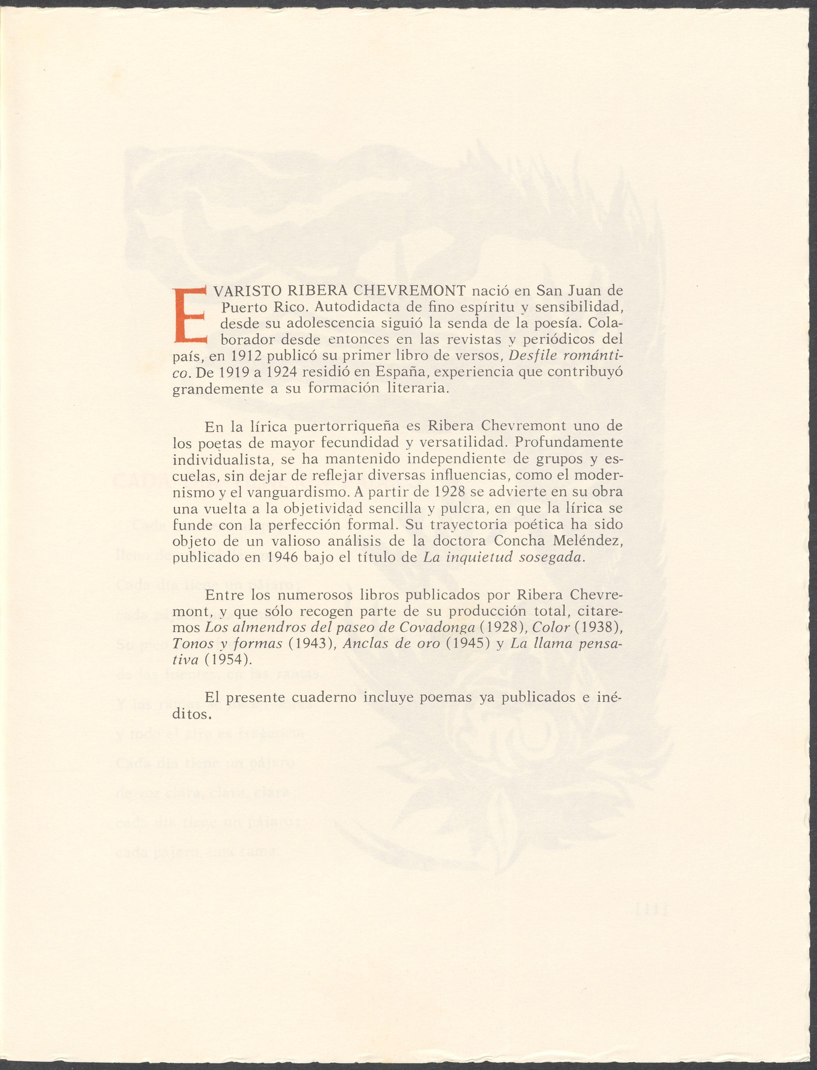 VARISTO RIBERA CHEVREMONT nació en San Juan de Puerto Rico. Autodidacta de fino espíritu y sensibilidad, desde su adolescencia siguió la senda de la poesía. Colaborador desde entonces en las revistas y periódicos del país, en 1912 publicó su primer libro de versos, Desfile romántico. De 1919 a 1924 residió en España, experiencia que contribuyó grandemente a su formación literaria.