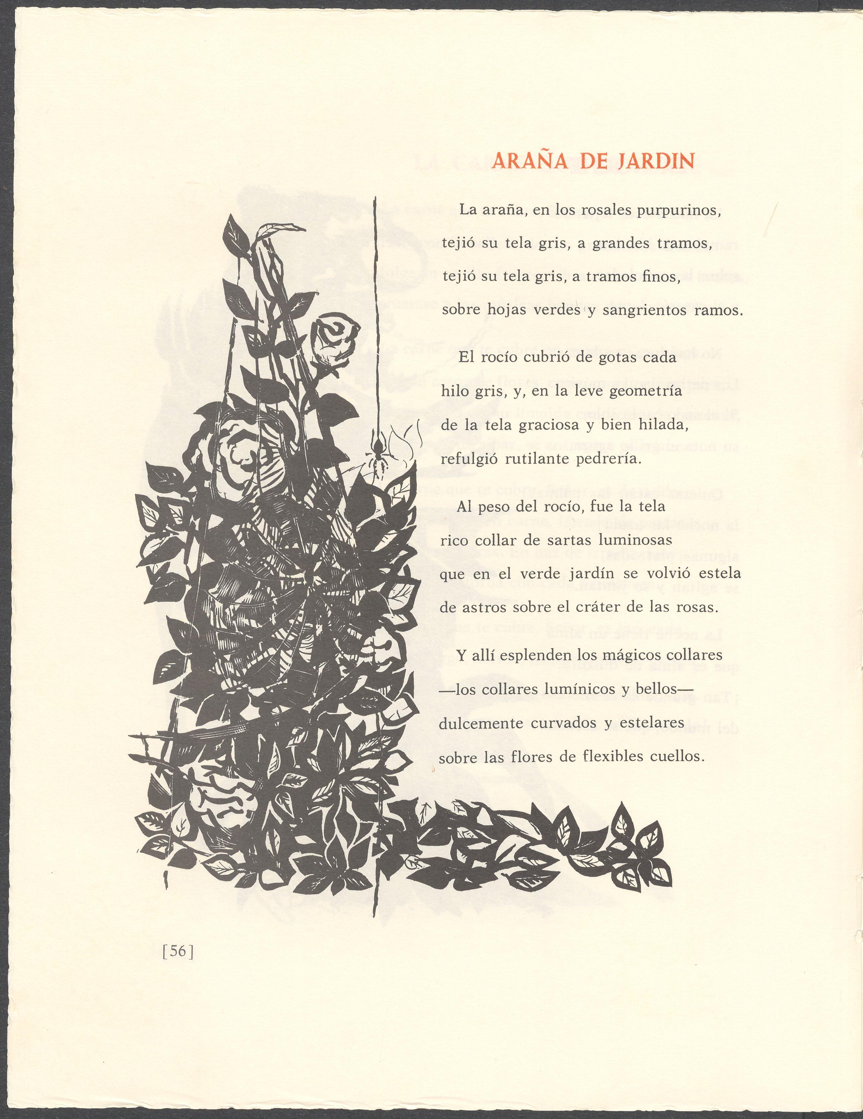 La araña, en los rosales purpurinos, tejió su tela gris, a grandes tramos, tejió su tela gris, a tramos finos, sobre hojas verdes'y sangrientos ramos.