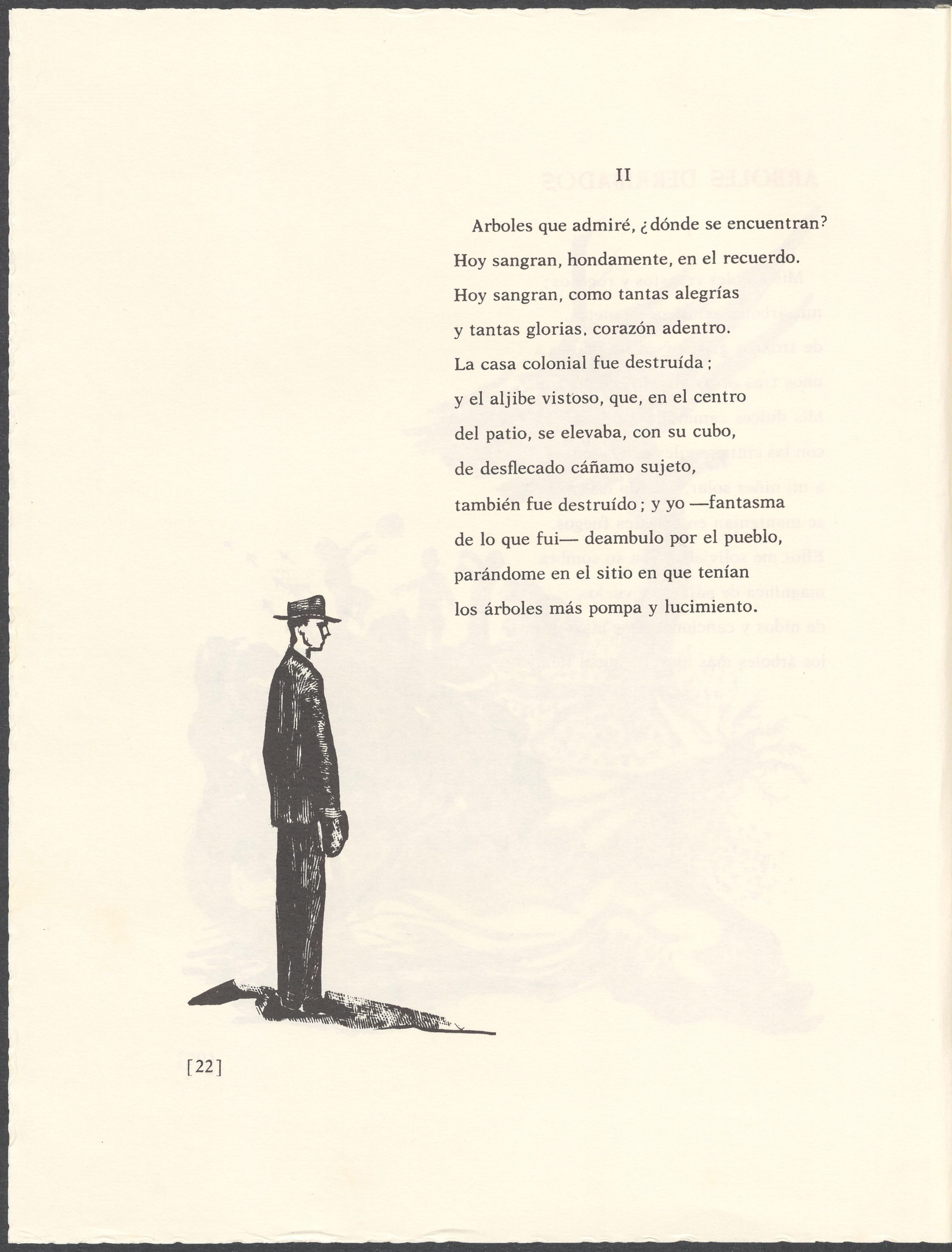 Mis árboles vetustos y rugosos ; mis árboles extáticos y quietos, de troncos grises y rojizas hojas, unos tras otros, derribados fueron. Mis dulces camaradas, enlazados, con las cintas azules de los juegos, a mi niñez solar, cuando las cosas se mantenían en celestes fuegos. Ellos me soliviaban con su sombra magnífica de pájaros y vuelos, de nidos y canciones. Que ellos eran los árboles más finos de aquel tiempo.