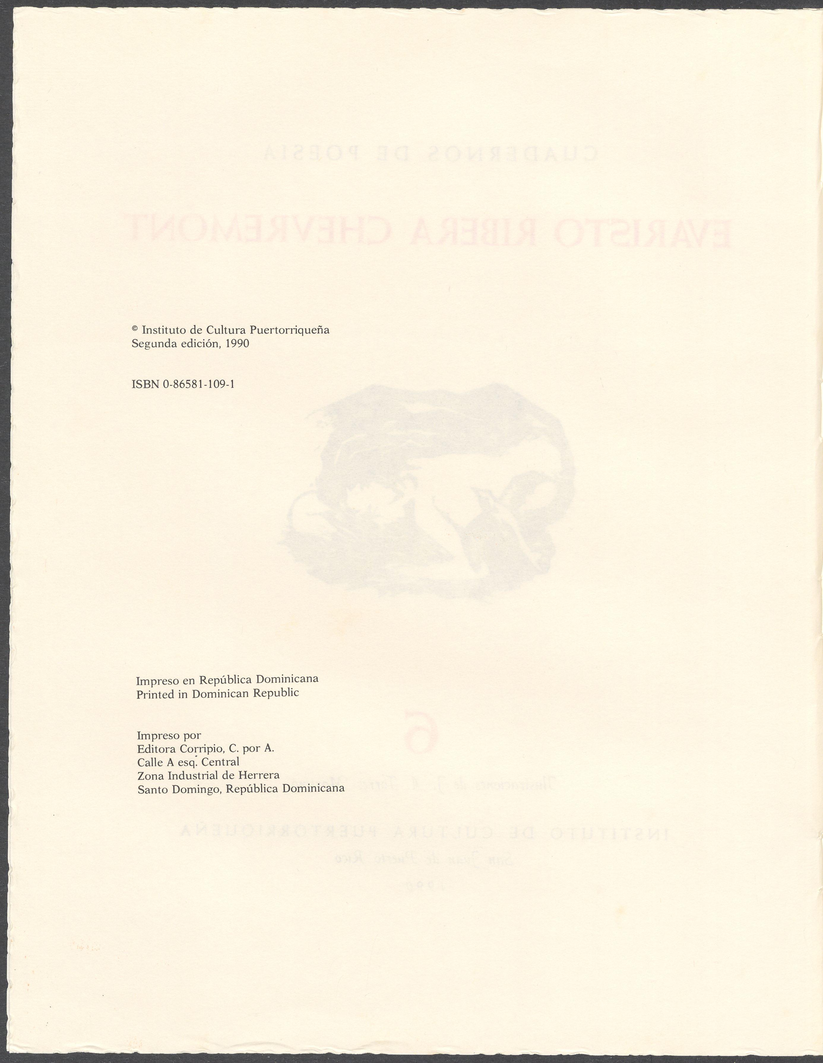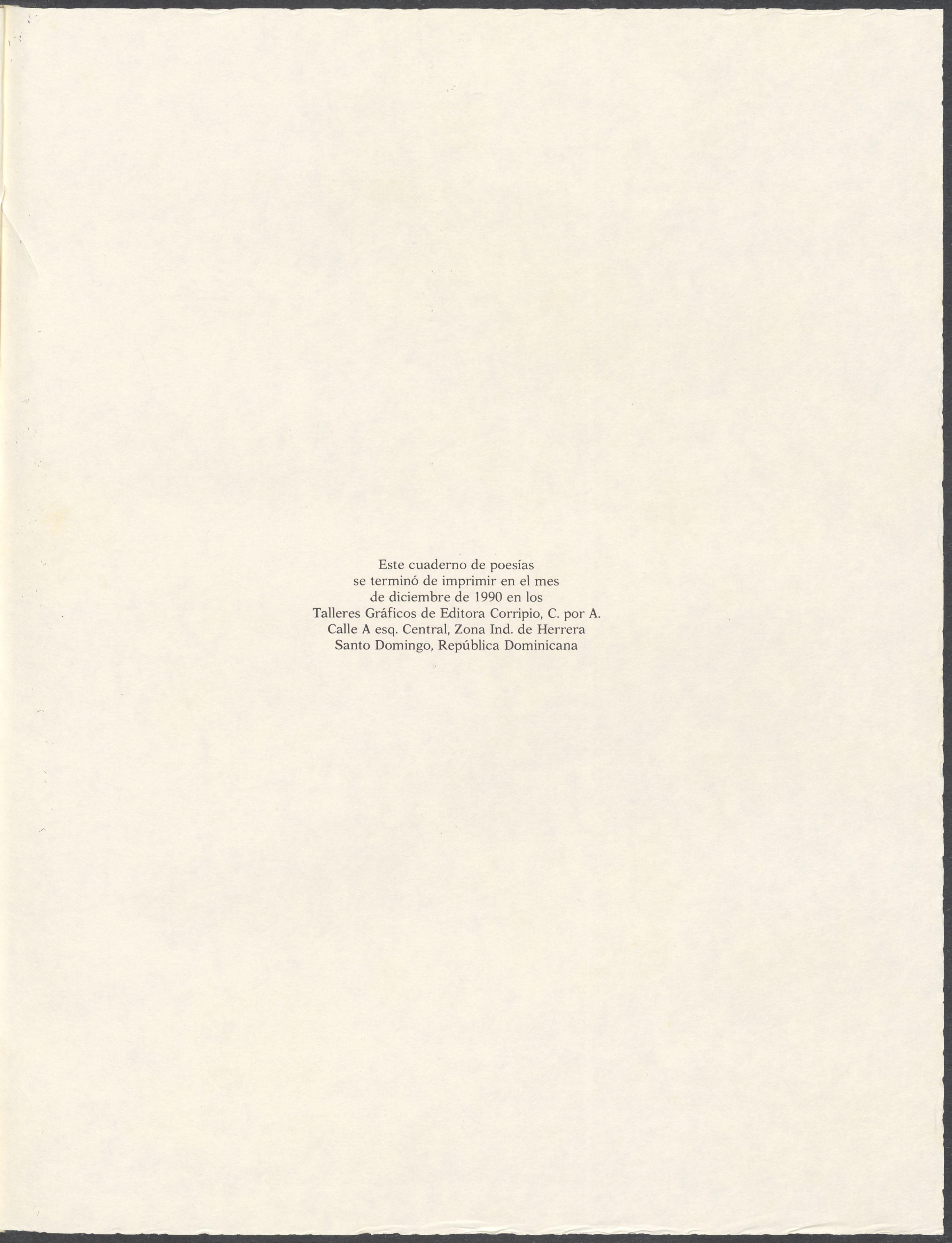 Este cuaderno de poesías se terminó de imprimir en el mes de diciembre de 1990 en los Talleres Gráficos de Editora Corripio, C. por A. Calle A esq. Central, Zona Ind. de Herrera Santo Domingo, República Dominicana