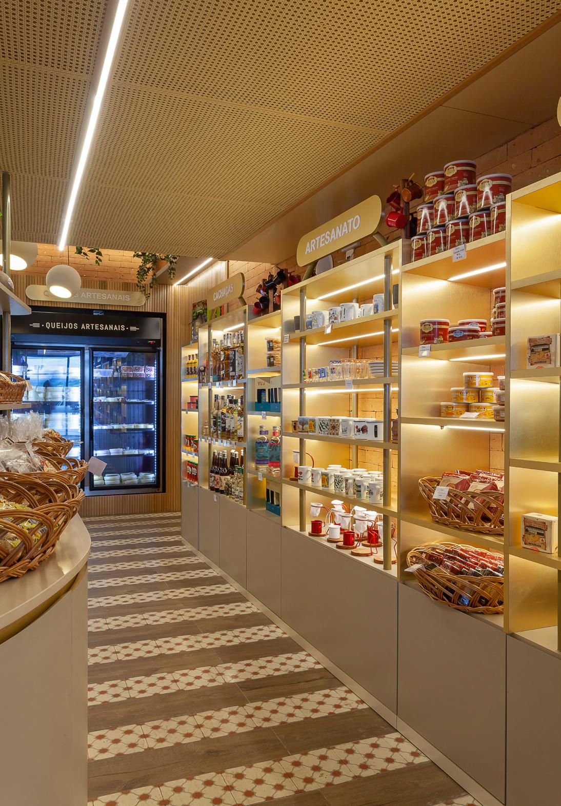 Ambiente com pé-direito baixo recebeu trilhos com projetores orientáveis de 8W/38° (665 lm) e 12W/38º (930 lm) para luz focal nos produtos, além de luminárias de 15W/36° (1600 lm) e 13W/15º55º (900 lm) para luz difusa.
