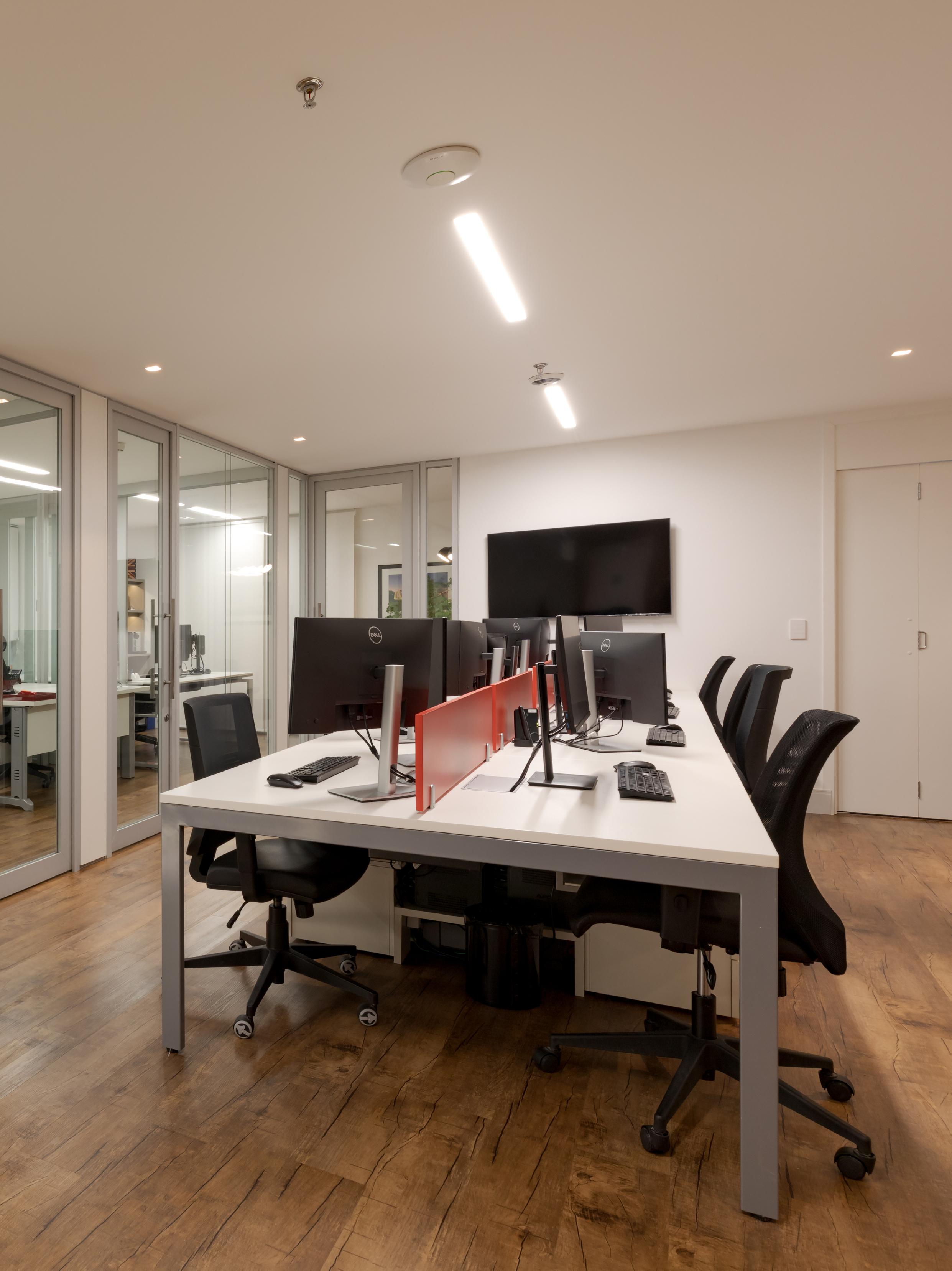 Para os ambientes com pés-direitos baixos, a opção foi por projetores orientáveis de 8W/38° (665 lm) e 12W/38º (930 lm) para luz focal nos produtos, além de luminárias de 15W/36° (1600 lm) e 13W/15º-55º (900 lm) para luz difusa. “Tínhamos toda a questão do cálculo para iluminar o mobiliário como uma