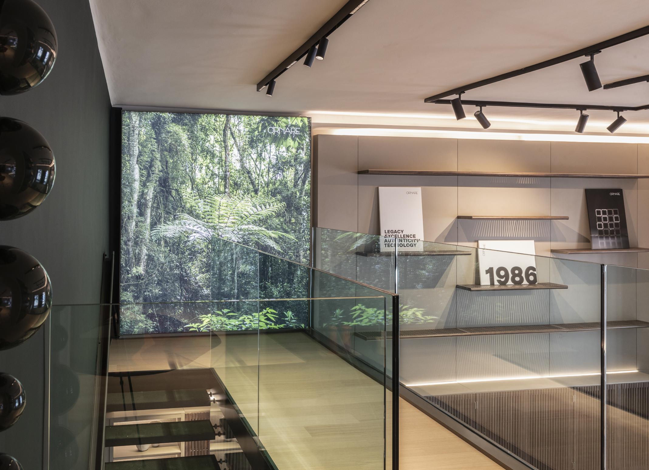 O projeto luminotécnico da Ornare Milano ficou a cargo da WeLight, que buscou gerar ambiências, destacando os produtos com os níveis corretos de iluminação. “Não temos excesso de luz, criamos ambientes gostosos para remeter à casa dos clientes. Para isso, utilizamos iluminação no plano vertical,