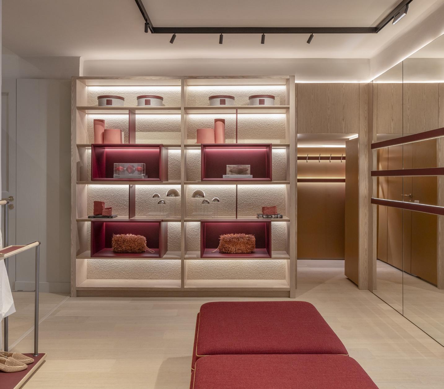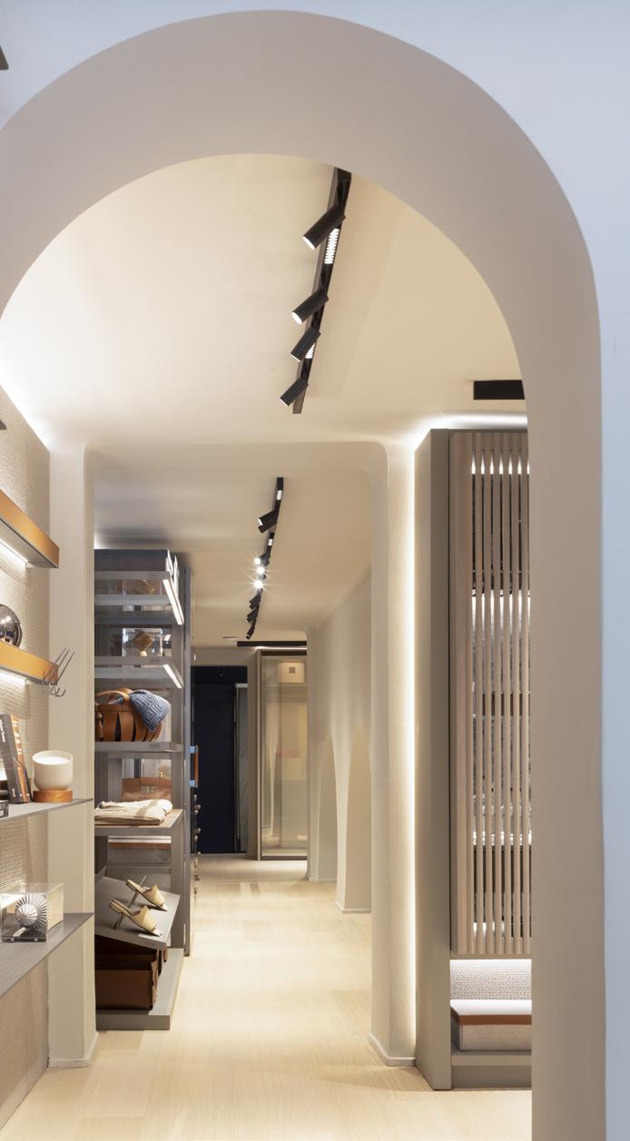 Outra característica muito presente no projeto da loja de Milão é a linearidade da luz, com a inserção de luminárias no mobiliário. “Temos luz no rodapé e no rodateto dos móveis com perfis equipados com fitas de LED de 10W/m e 1000 lm/m, tudo incluído em nossos cálculos. Onde tínhamos o pé-direito muito baixo, usa-