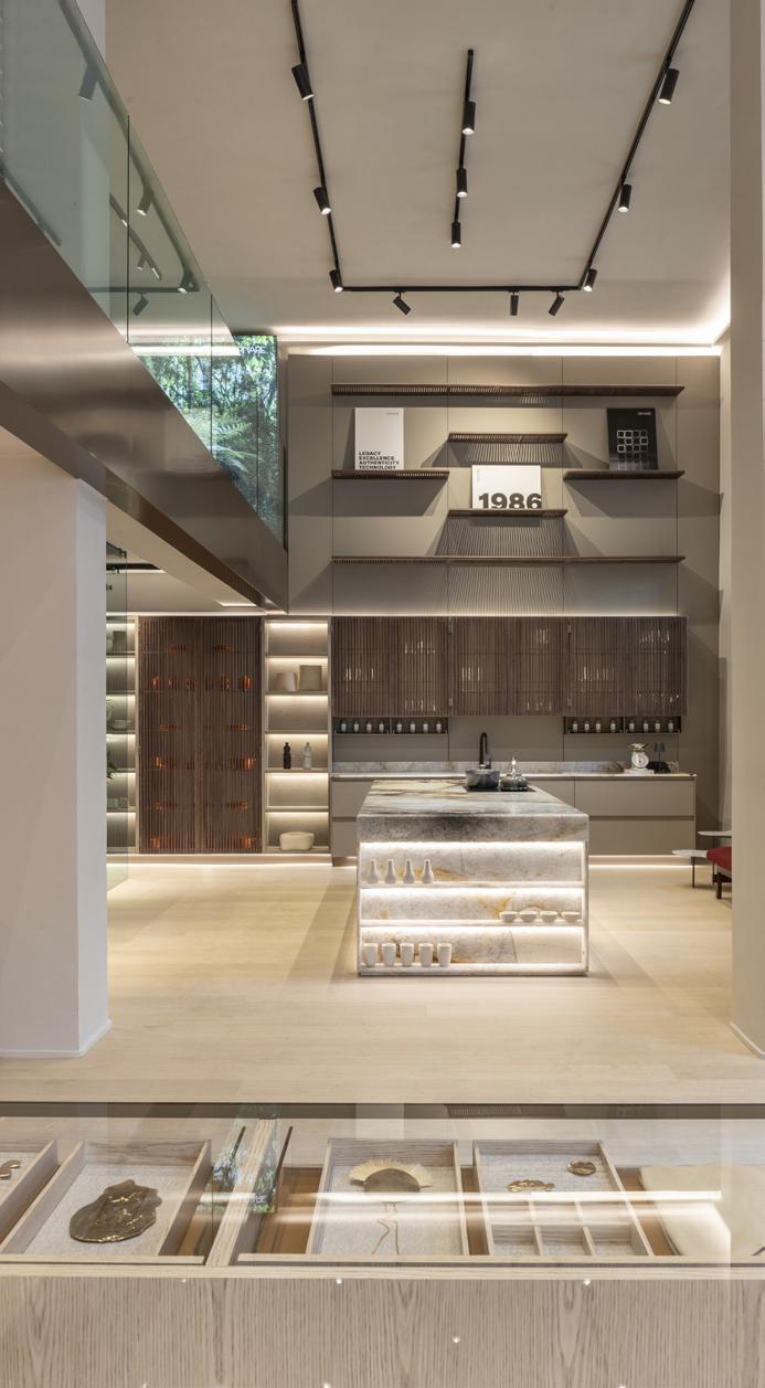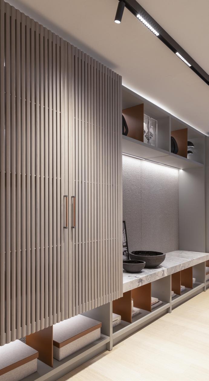 projeto e fiz todas as aferições. Então quando falamos de um projeto bem sucedido, não é só a iluminação, é a instalação, são os produtos, é o comprometimento de todos, é o sistema de controle; todos esses elementos à volta precisam estar em sintonia, por isso é necessário que haja sinergia o tempo todo com todos aqueles envolvidos no projeto, inclusive o cliente. Desenvolvemos algumas luminárias especialmente para esse projeto, principalmente as instaladas no topo dos armários, e criamos um ‘anteparozinho’ produzido pela própria Ornare, ou seja, houve uma integração muito grande e uma vontade de todos os participantes de que o projeto fosse um sucesso”.