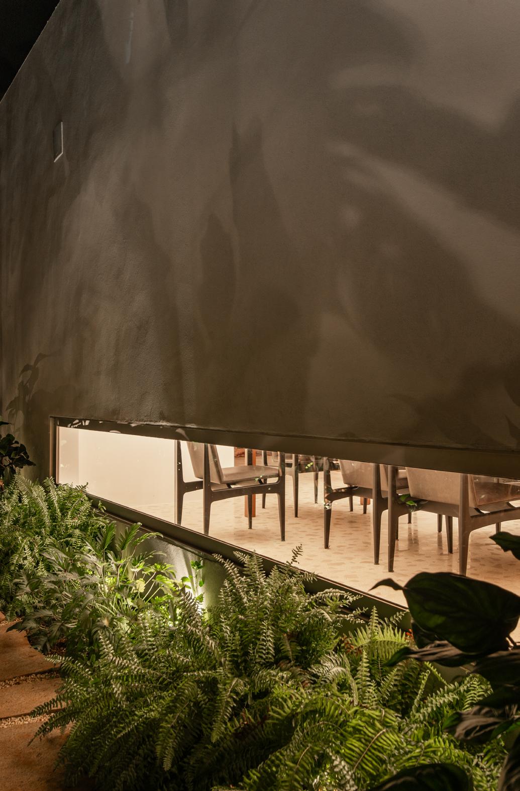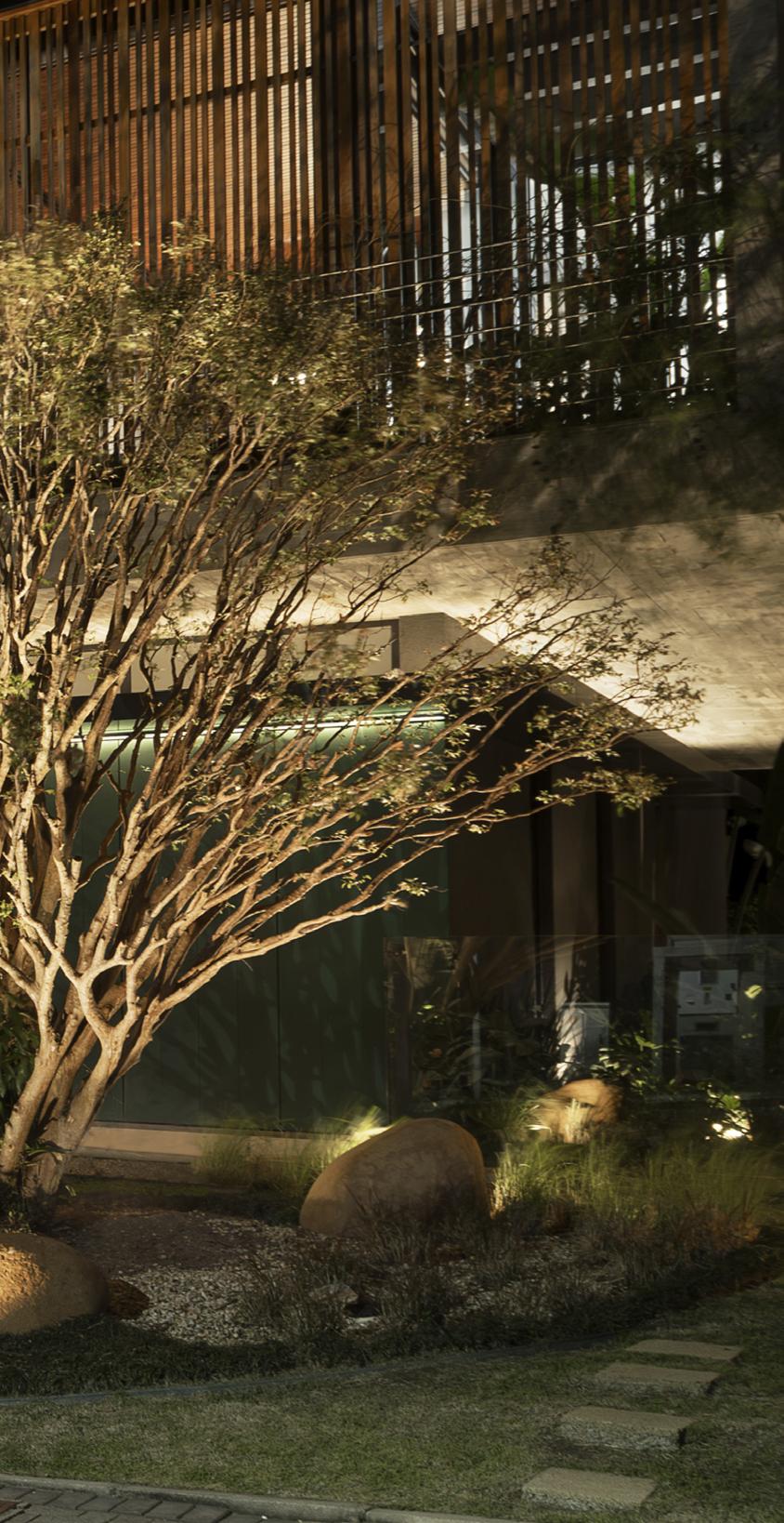Para Adriel, a iluminação do paisagismo é um item de muito acolhimento, pois proporciona conforto para qualquer área em que a pessoa esteja na casa: “A luz é funcional para todo o caminhar, mas também traz uma brincadeira entre luz e sombra. Como a vegetação é bastante densa, a luz cria projeções de sombra na fachada lateral. Então, conforme você vai entrando na casa, há essa valorização do paisagismo quase como uma obra de arte”.
