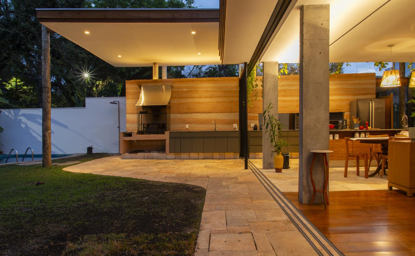 Dois perfis metálicos embutidos no forro com fitas de LED de 22,5W/m, 2112 lm/m, a 2700K, proporcionam luz geral e delimitam espacialmente o living, enquanto perfis de LED de 9,6W/m, 1152 lm/m a 2700K destacam os nichos em pedra. Há, ainda, embutidos no frame de 7W/22º, 422 lm, a 2700K acima da bancada da churrasqueira para luz de tarefa.