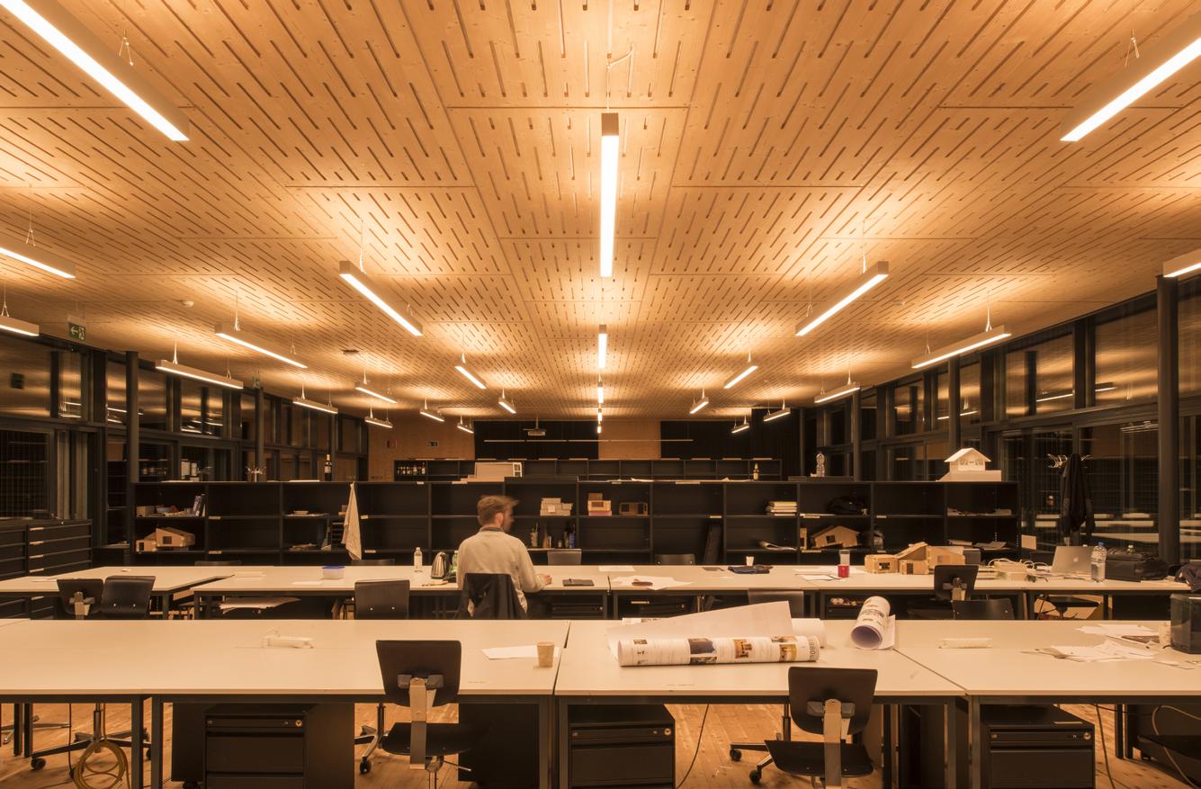 Duas linhas de perfis de LED de 22,5W/m, 2112 lm/m, a 2700K em todo o perímetro da academia reforçam sua estética voltada ao industrial.