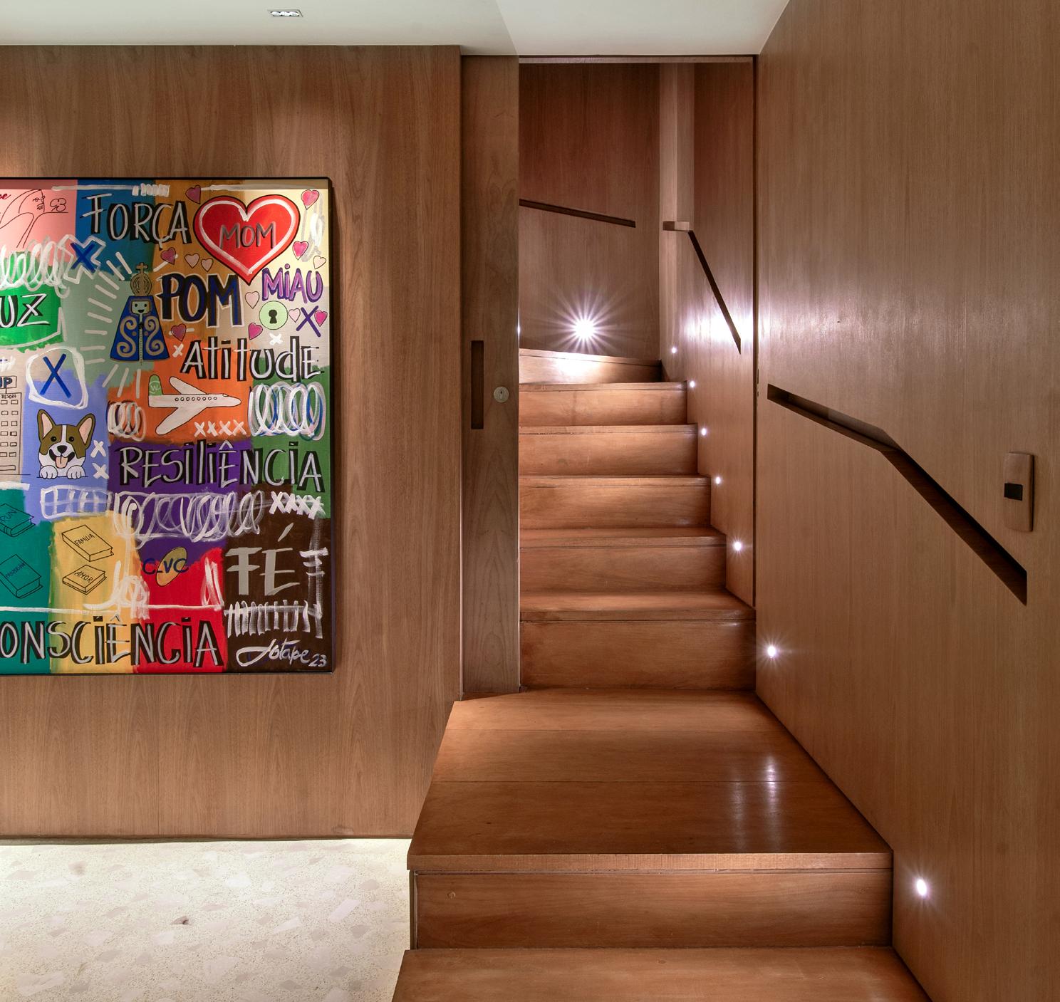 Embutidos no frame de 7W/22º, 422 lm, a 2700K iluminam o quadro e o hall de entrada, consequentemente. Já as escadas receberam balizadores na parede de 1,2W, 4 lm, a 2700K.