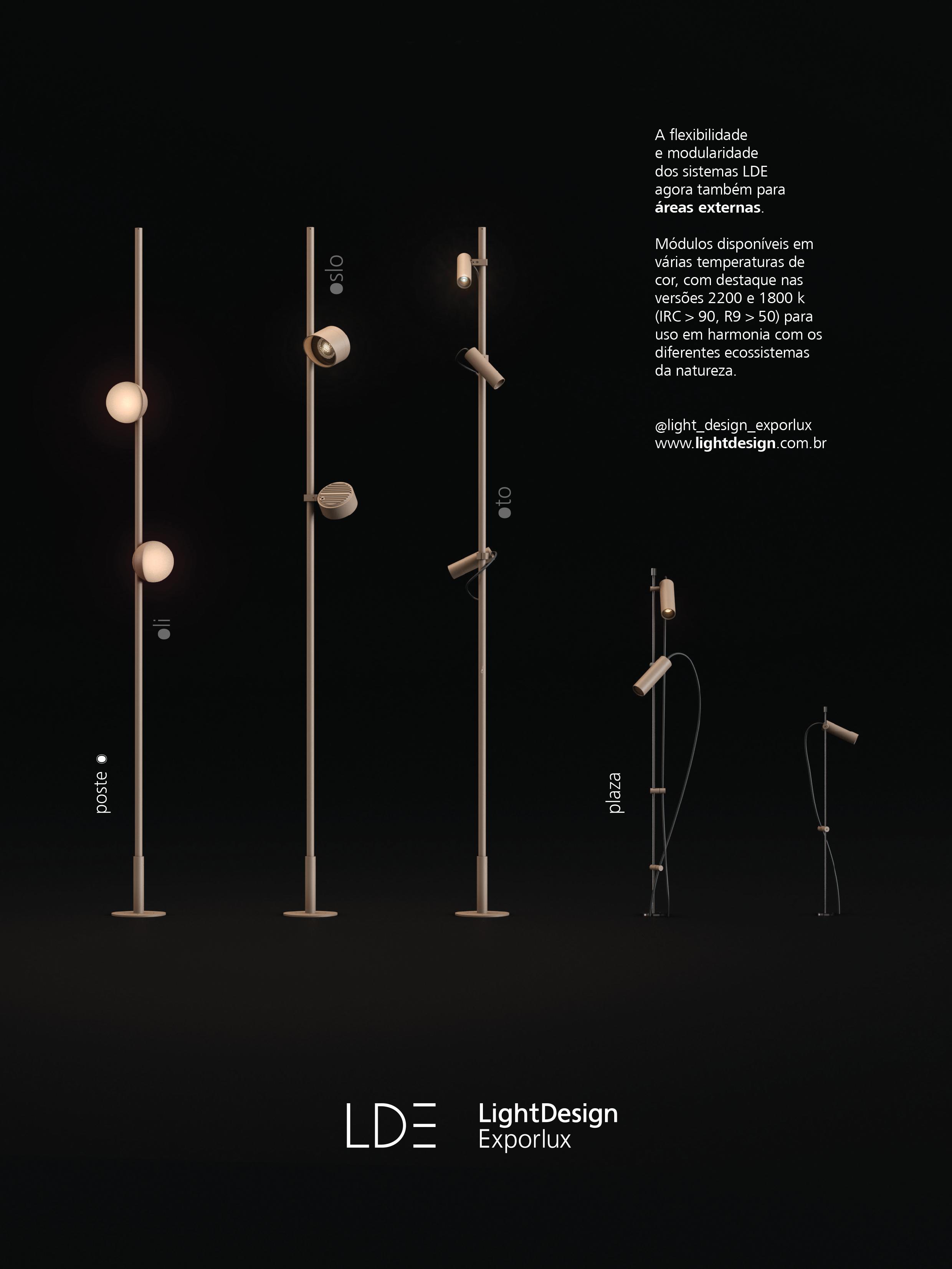 Indicada para áreas externas, a linha Plaza, da LightDesign Exporlux, chega com descrição e robustez nas versões base e espeto. O seu conjunto mecânico é composto por haste em inox e miniprojetores com potências que variam de 1W a 6W totalmente reguláveis para se adaptarem às mudanças de realidade, alteração dos espaços, crescimento ou diminuição da vegetação. Destaque para as versões com temperatura de cor mais quentes, como 2200K, com IRC 90 e R9 >50, para maior equilíbrio do ecossistema. lightdesign.com.br