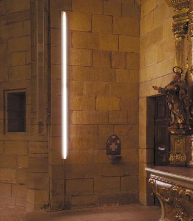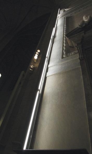 medios para lograr una instalación reversible, de modo que cuando convenga pueda ser retirada sin dejar otro rastro que una manera de proceder respetuosa con el patrimonio histórico. Por otro lado estaba la conservación ambiental, más sutil, que depende de otros factores. Lo ideal sería que todo el equipamiento moderno y necesario para complementar o sustituir a la luz natural pudiera quedar oculto a la vista de modo que la arquitectura y la decoración no se contaminaran visualmente. Por desgracia esto en muchos casos no es posible y en el que nos ocupaba menos, pues la iglesia no dispone de cornisas, triforio u otros elementos arquitectónicos en los que ocultar los equipos de iluminación. En esta situación, optamos por buscar fórmulas que, amparadas en la simetría vinieran a resolver la iluminación artificial de la mejor manera posible.