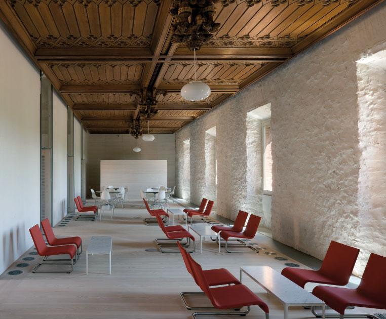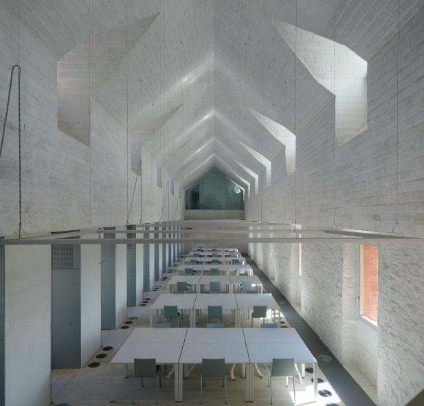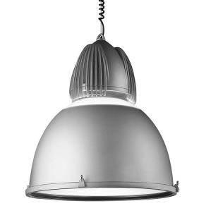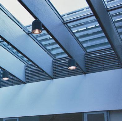 Por otro lado convenía pensar en un sistema alternativo, únicamente para la nave central, que complementara o sustituyera a la iluminación lateral en las ocasiones que se considerara oportunas, especialmente en el uso cotidiano. Este sistema directo tenía que enviar también una pequeña parte de flujo al hemisferio superior que iluminara someramente las cúpulas. En este caso, dado que en la filosofía de trabajo de nuestro equipo no encaja realizar un diseño específico cuando ya existe la luminaria que andamos buscando, elegimos un modelo Berlino de Iguzzini (fotografía 10), de carácter aparentemente industrial, pero de indiscutible valor formal. Esta luminaria se fabrica para lámparas de vapor de mercurio con halogenuros metálicos y afortunadamente ya encontramos en el mercado fuentes en esta gama de Tc 2800K e IRC de 90 que podemos usar en esta aplicación. Estas lámparas también dispondrían de un sistema eléctrico de subida y bajada para el correcto mantenimiento.