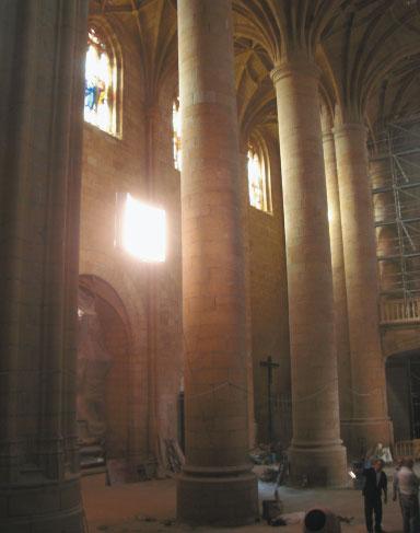 Las luminarias, dado que su tamaño no iba a ser despreciable, se posicionarían con simetría entre los pilares obstaculizando lo menos posible la perspectiva en la dirección principal de observación. Ubicados en el bajo coro y mirando al altar mayor, sólo percibiríamos las dos primeras, quedando el resto apantalladas por los pilares.