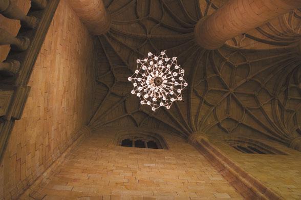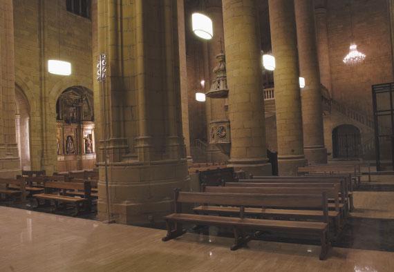 Es frecuente encontrar en las iglesias lámparas antiguas (fotografía 2) de mayor o menor valor que, debidamente restauradas, pueden volver a emplearse. En general el efecto es bueno y ayuda a entender la evolución de la iluminación artificial y la tecnología en el interior de los edificios históricos. En este caso disponíamos de una valiosa lámpara de araña que nos resolvía la iluminación del acceso al coro en donde las lámparas modernas diseñadas no encajaban formalmente (fotografía 12).