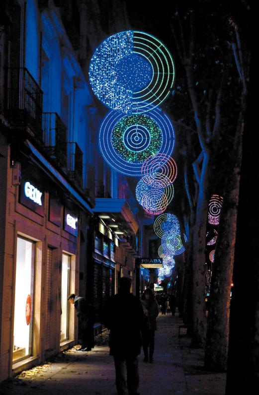 La arquitecta Teresa Sapey fue la encargada de poner luz a la remodelada calle de Serrano, con un diseño formado por círculos, de estilo pop, muy colorista y desenfadado. Esta singular arteria comercial de Madrid estrenaba tras su remodelación un alumbrado navideño acorde con su renovada funcionalidad y estética.