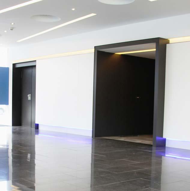 Una pared cubierta de vegetación que recorre las cuatro plantas del atrio simboliza la orientación ecológica de la arquitectura. Aquí se ubican también las áreas de uso común, tales como salas de conferencias o cafeterías para los oficinistas. Montados en sistemas de raíles electrificados suspendidos libremente en el espacio, los proyectores LED Logotec de haz intensivo salvan incluso grandes distancias entre la luminaria y la super-ficie de destino. zyxx