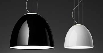 Material: cuerpo de aluminio pintado, difusor de material termoplástico, campana superior en cristal bososilicado arenado. Un nuevo acabado perfectamente liso y brillante confiere elegancia al clásico modelo Nur. Todas las versiones están curvadas por un difusor en la parte inferior.