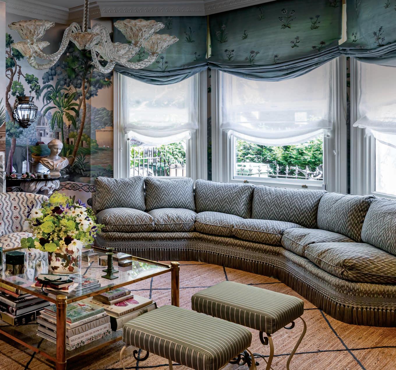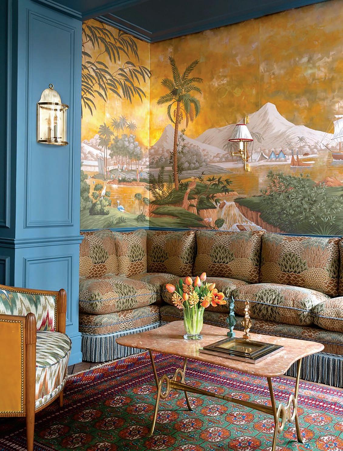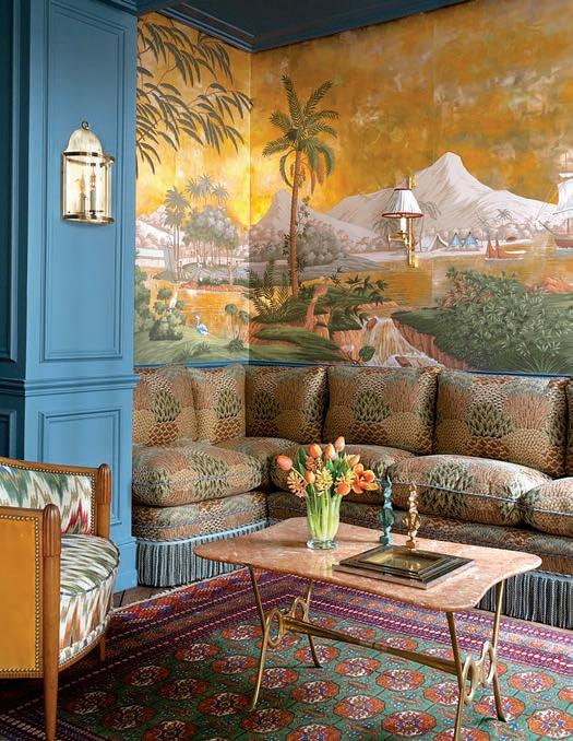 La casa combina colores pálido y vibrantes. El sofá está forrado con tela que proviene de Clarence House y en la pared, un papel de su firma.