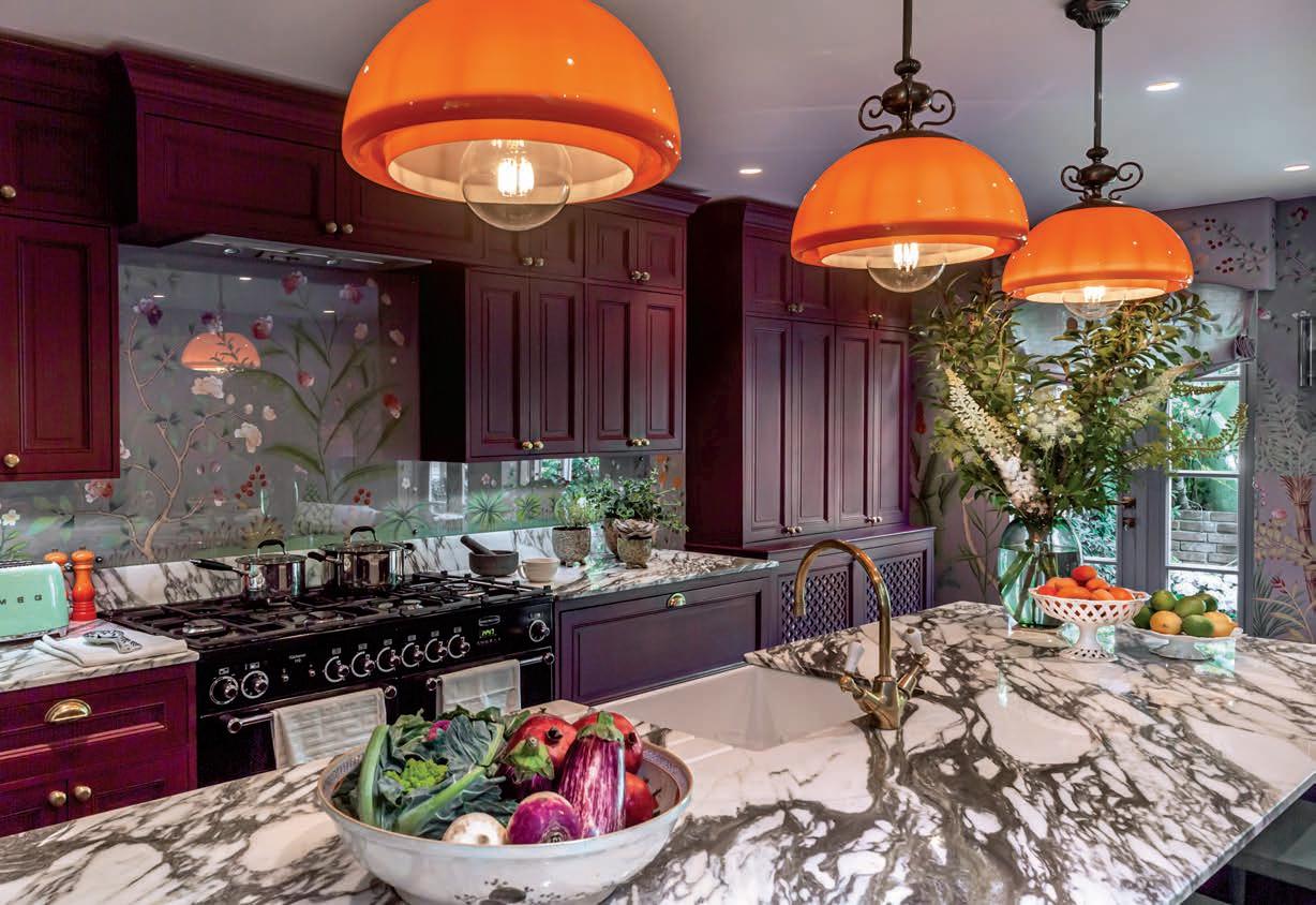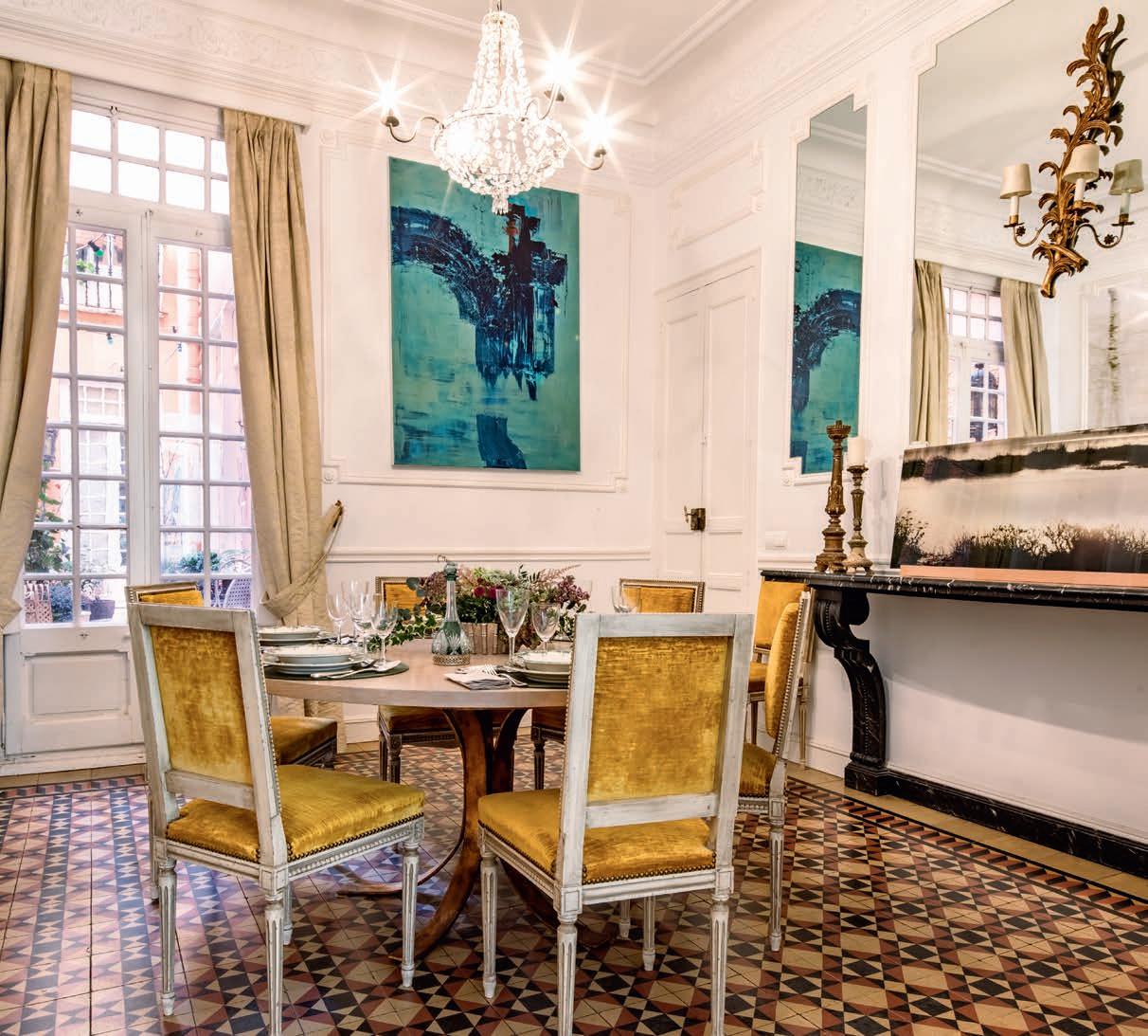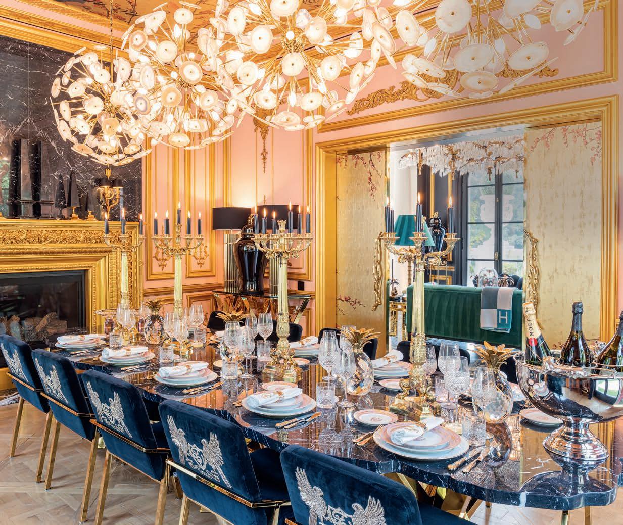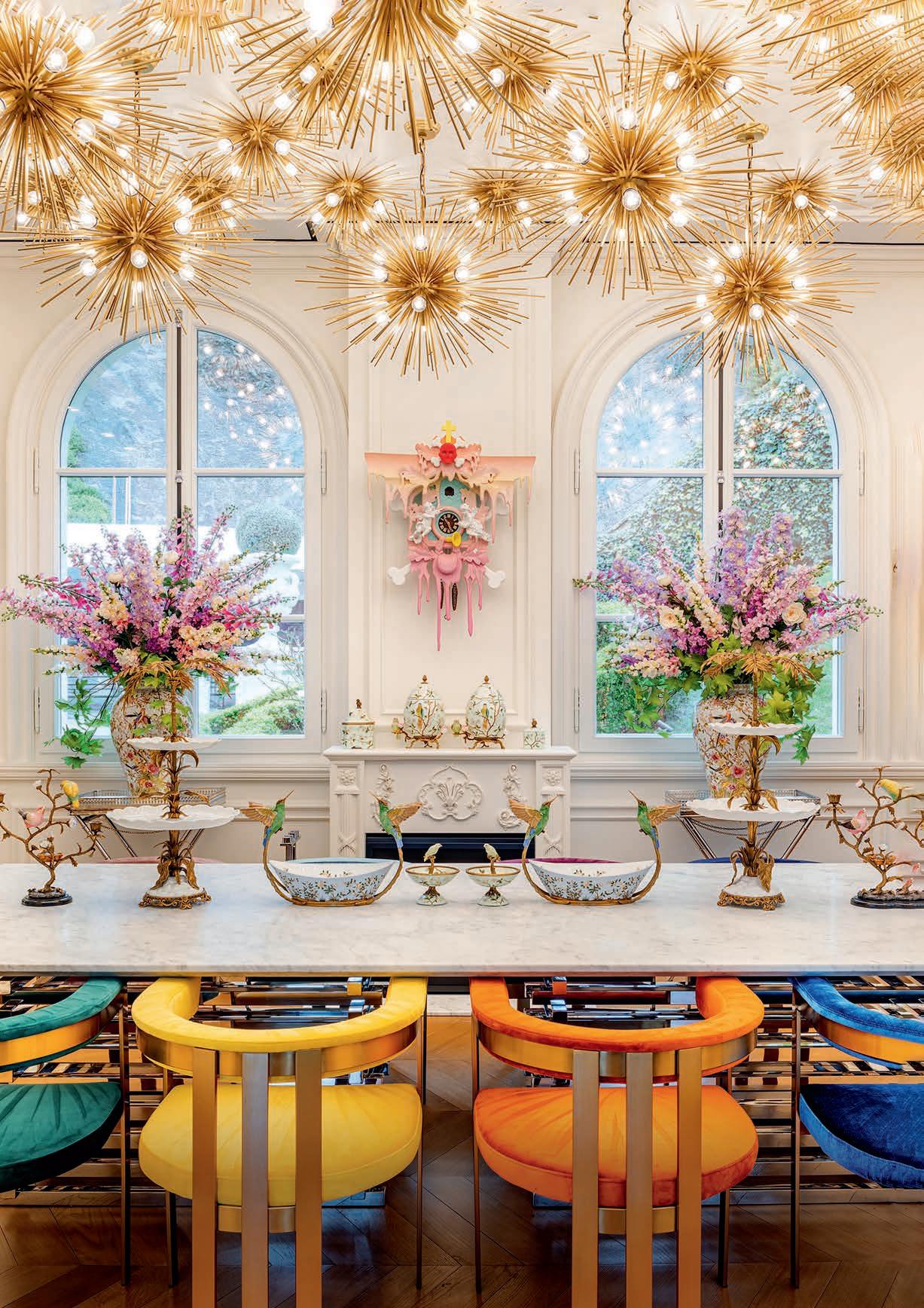 En esta página, la cocina, cuyo estilo romántico contrasta con el del resto de la mansión, presidida por un reloj de cuco. A la derecha, el comedor, una oda a la ópera de Mozart «Papageno y Papagena» (cuyo motivo se puede ver bordado en las sillas) y revestido con madera «vintage» que procede de un castillo de Francia