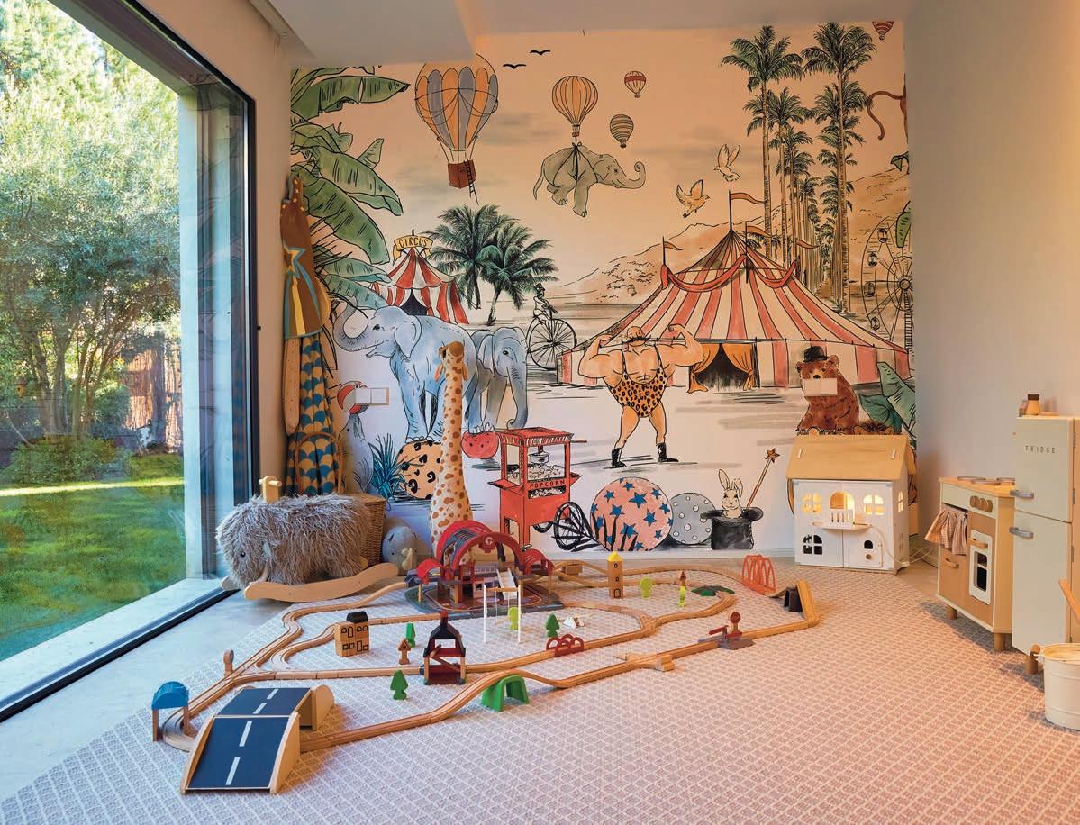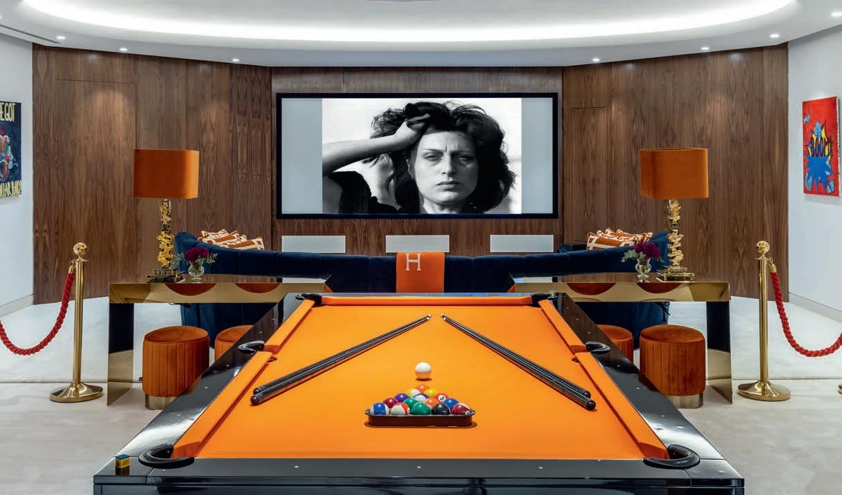 —¡La guarida del lobo! Está repleta de objetos, me emocioné un poco. Las paredes están forradas de cuero «croco». Tiene un salón con chimenea. El marco del cabecero de la cama, hecha a medida, tiene una característica luz en el interior. También hay un juego de ajedrez, en cuero, con el logotipo grabado. Luego tenemos el menú de almohadas, que se llama «Los niños “cool” nunca duermen»; puedes decir qué almohada pre eres: más dura, más blanda, más alta… A cada lado de la cama, se puede ver un escudo del «château» con el menú. También tengo una bicicleta de entrenamiento de bra de carbono, muy futurista. El gimnasio estará en la casa de arriba, pero, mientras, cuando vengo aquí tengo una bicicleta y las pesas con mi logotipo. El vestidor está todo cubierto con papel pintado. Imprimimos el papel en el cristal, va sin costuras, continúa e incluso cuando vas al baño estás en una jungla, la jungla del rey. La ropa de cama se hace a juego con la casa, las colchas, las zapatillas… Tenemos dos habitaciones de invitados idénticas. El cuarto de baño es muy sencillo porque es de invitados. Todas las habitaciones son iguales, solo jugamos con los colores, todo tiene que combinar.