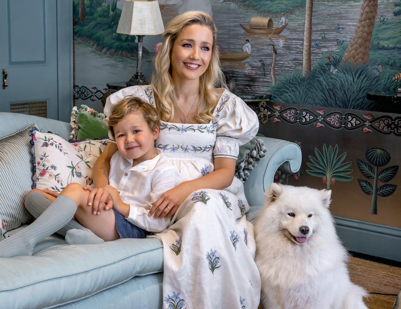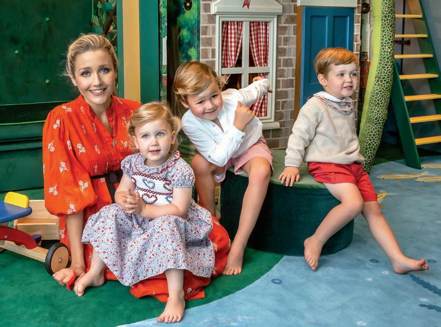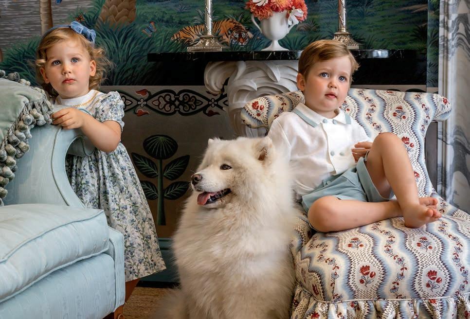 Arriba, Hannah y George con su perra, «Gyda». Derecha, los gemelos Scarlett y Oscar. En la otra página, un rincón de otra de las salas. El sofá está forrado con tela que proviene de Clarence House y en la pared, un papel de su firma. En ellos trabajan de seis a diez personas, les lleva unas 150 horas producir un solo panel y se necesitan 20 para un diseño. Todo es a mano, siguiendo la tradición de los siglos XVII y XVIII. Izquierda, un bodegón sobre un mueble de marquetería Luis XVI y jarrón de cerámica y plata de Patrick Mavros