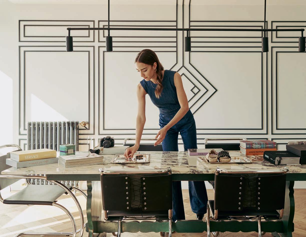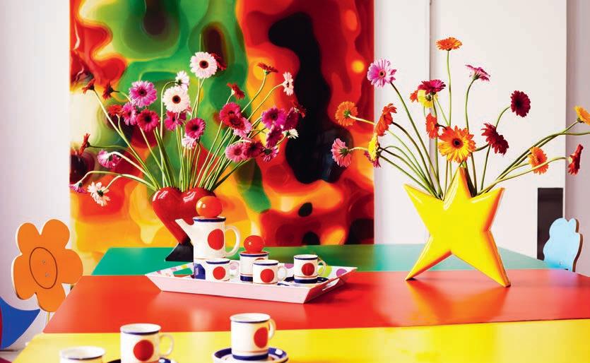 En la imagen superior, Ágatha es retratada en los pupitres que, en su conjunto, forman la mesa de comedor. En la misma estancia, también se encuentra una inmensa librería y una obra de Peter Zimmermann, que cuelga en la pared. En la imagen inferior, un detalle de la mesa de Ágatha, con unos jarrones diseñados por ella y una divertida vajilla de café.