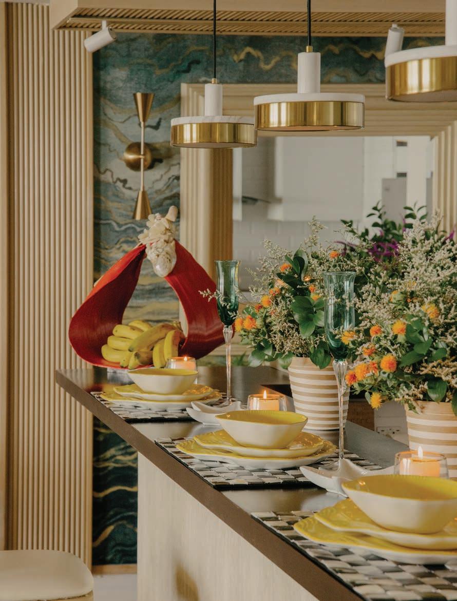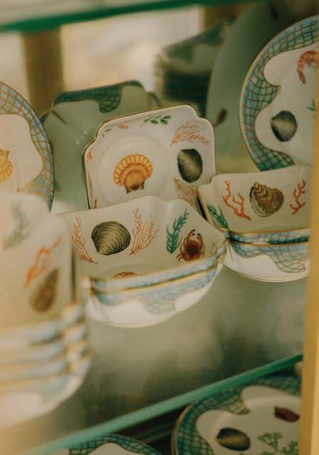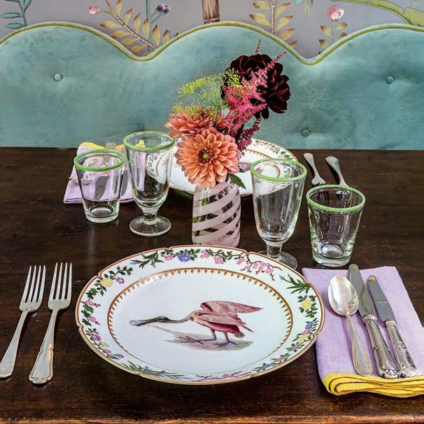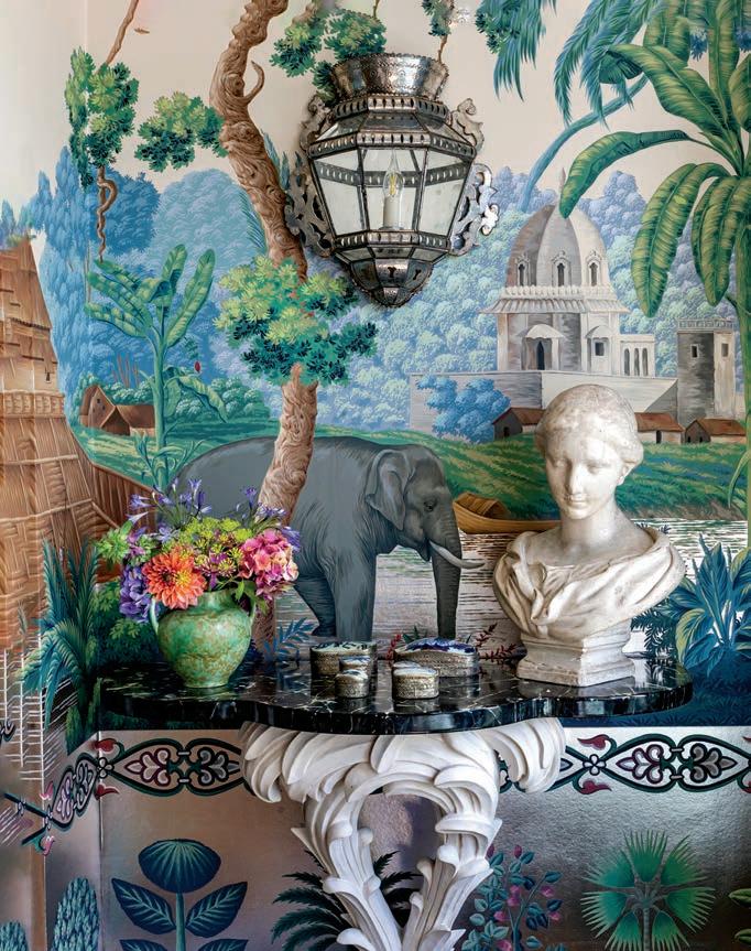 Junto a estas líneas, el comedor, con cubertería de plata de herencia familiar y platos de porcelana pintados a mano, de De Gournay. En la otra página, arriba, detalles sobre una consola, con papel de inspiración india. Abajo, la cocina, donde también tienen papel, protegido con una pantalla