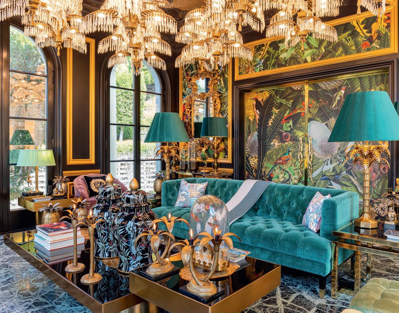 Lámparas de techo de araña, de mesa con formas vegetales, papel pintado selvático y un pavimento de mármol verde traído de Italia componen la sala de la jungla. Abajo, otra estancia de la casa, forrada de madera y en cuya mesa central reposan varios Ufo Robot Goldrake junto a lujosos jarrones y un centro de flores exóticas