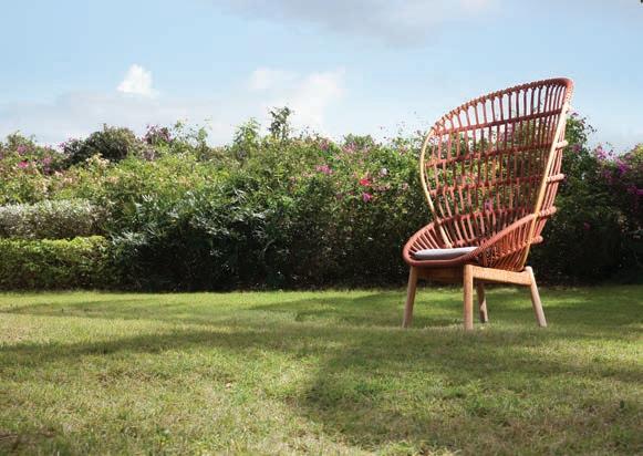 Ingrid posa en un colorido sillón de mimbre en uno de los rincones del jardín concebido para la desconexión, donde el estilo del mobiliario se integra a la perfección con la naturaleza del entorno.