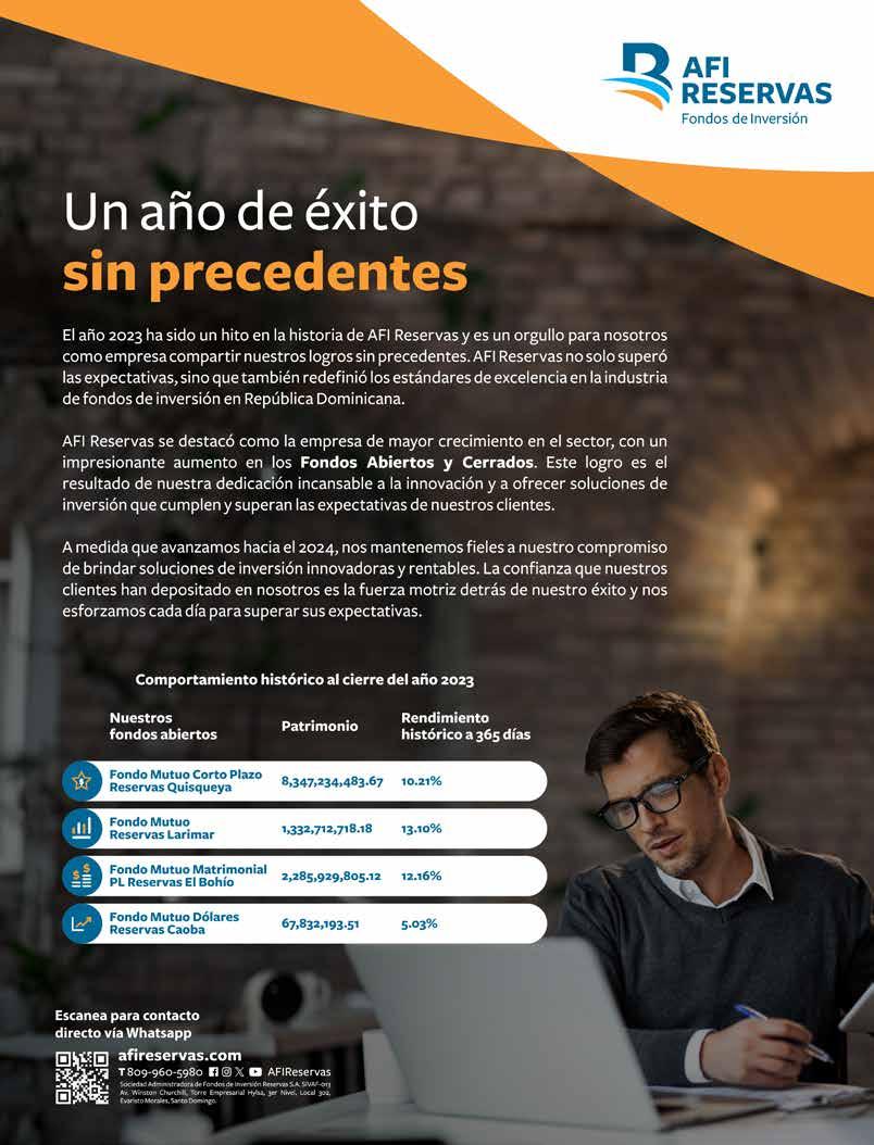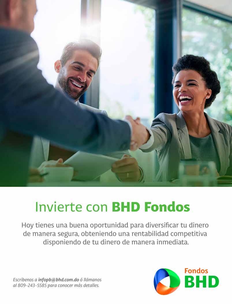 ABRIL 2024 14 ww Nombre del fondo AFI Moneda Activos en DOP 30 días 90 días 180 días 360 días FCDS Advanced Oportunidades ADVANCED DOP 3,085,320,184 7.50% 10.48% 10.47% 12.99% FCDS Advanced Oportunidades II ADVANCED DOP 5,501,831,501 -0.30% 5.51% 5.40% 7.98% Advanced Inmobiliario I ADVANCED DOP 1,201,237,246 1.37% 124.34% 52.63% 26.04% Altio Energía ALTIO USD 18,259,550,828 3.98% 12.50% 7.65% 6.64% Desarrollo Socied. Altio II ALTIO USD 7,615,347,982 -4.80% 7.21% 3.14% 1.52% Inmobiliario Altio I ALTIO DOP 7,559,254,298 4.28% 13.91% 9.41% 7.17% Renta Fija Altio ALTIO DOP 1,720,820,515 7.65% 10.71% 8.59% 10.40% Renta Fija Altio United Capital ALTIO DOP 612,309,838 17.54% 13.67% 6.62% 8.21% Fondo de Fondos Cerrados Altio I ALTIO USD 363,368,140 4.61% 12.31% * * BHD Cerrado de Desarrollo I BHD USD 3,351,457,518 3.79% 3.89% 4.07% 4.41% BHD Inmobiliario Dólar I BHD USD 1,415,076,617 6.76% 8.80% 7.52% 7.12% Desarrollo Excel I EXCEL DOP 674,420,377 9.25% 10.20% 10.03% 9.80% Inmobiliario Excel I EXCEL DOP 3,547,072,890 5.68% 7.39% 8.61% 7.28% Inmobiliaro Excell II EXCELL USD 8,799,018,192 6.37% 8.12% 8.88% 7.02% JMMB Cerrado de Desarrollo JMMB DOP 165,966,710 -2.56% -2.49% 0.32% * JMMB Dllo. Soc. Energia Sostenible JMMB USD 2,504,015,445 -10.69% 6.19% 3.22% 1.73% JMMB Cerrado Inmobiliario I JMMB DOP 1,695,709,568 4.15% 9.26% 8.65% 6.50% JMMB Cerrado Inmobiliario II JMMB USD 3,449,484,817 6.07% 6.72% 7.95% 5.73% Pioneer Dllo de Sociedades II PIONEER DOP 11,199,035,426 -1.20% 213.22% 76.57% 32.14% Pioneer Dllo. Soc. Impacto Social PIONEER DOP 958,351,551 4.96% 5.17% 5.39% 6.03% Desarrollo Socied. Pioneer PIONEER DOP 9,851,541,386 -0.91% 50.82% 25.46% 15.14% Cerrado Pioneer Inmobiliario II PIONEER DOP 4,324,741,056 -0.17% 43.64% 22.65% 15.82% Pioneer United Renta Fija PIONEER DOP 878,353,421 10.53% 11.29% 9.99% 8.10% Desarrollo Soc. Popular POPULAR DOP 11,643,465,080 -0.74% 80.13% 35.60% 19.37% Renta Inmobiliaria Pesos Popular POPULAR DOP 586,661,116 11.68% 10.87% 10.31% 9.93% Renta Inmobiliaria Dolar Popular POPULAR DOP 3,303,674,394 6.06% 17.34% 11.50% 8.79% Recurrente Popular POPULAR DOP 1,395,068,816 6.66% 18.44% 13.47% 10.52% Capitalizable Popular POPULAR DOP 1,686,459,251 6.92% 17.00% 13.20% 12.82% Desarrollo Reservas I RESERVAS DOP 9,544,160,748 6.18% 5.70% 10.12% 8.63% Desarrollo Reservas USD II RESERVAS USD 2,385,185,356 6.38% * * * Inmobiliario Reservas I RESERVAS DOP 6,664,835,845 6.56% 14.79% 10.69% 9.43% Inmobiliario Reservas II RESERVAS DOP 263,616 -100.00% * * * Universal Dllo. De Viviendas RD I UNIVERSAL DOP 2,472,546,018 -3.83% 182.82% 68.00% 30.51% Dllo.Infraestructura Energetica I UNIVERSAL USD 26,290,029,718 -2.02% 655.68% 109.28% * Universal Dllo. De Viviendas RD II UNIVERSAL DOP 518,405,192 10.56% 9.49% * * Inmobilario Universal I UNIVERSAL DOP 7,254,150,753 5.02% 15.18% 10.07% 7.58% Libre Desarrollo Infraestructura UNIVERSAL DOP 14,479,712,592 7.80% 10.64% 9.69% 9.12% Fondo AFI Moneda Activos en DOP 30 días 90 días 180 días 360 días Fondo de Inversión Altio Liquidez I ALTIO DOP 1,439,932,024 9.16% 10.01% 9.74% * Fondo de Inversión Altio Liquidez USD ALTIO USD 397,437,934 4.50% -21.36% * 11.24% BHD Liquidez BHD ,BHD 9,452,605,421 9.65% 10.09% 10.19% 11.09% BHD Plazo 30 días BHD DOP 2,907,885,486 9.63% 9.74% 9.58% 10.87% BHD Tu Futuro BHD DOP 287,188,592 8.08% 8.38% 8.03% 9.97% BHD Plazo 90 días BHD DOP 827,910,565 6.70% 7.00% 6.45% 8.70% BHD Plazo 30 días Dólar BHD USD 3,455,458,539 2.82% 4.92% 3.85% 10.31% Liquidez Excel EXCEL DOP 3,029,978,383 8.43% 8.12% 8.37% 9.50% Fondo Abierto Dinámico Excel EXCEL DOP 1,091,524,162 11.13% 11.33% 11.46% 8.94% Liquidez Excel Dólares EXCEL USD 2,184,881,243 4.15% 4.42% 4.69% 7.74% JMMB Mercado de Dinero JMMB DOP 1,673,555,990 6.63% 7.15% 7.24% 8.40% JMMB Plazo 90 Dias JMMB DOP 627,832,711 2.39% 2.47% 4.08% 6.34% JMMB Mercado Dinero Dólares JMMB USD 1,598,477,355 4.22% 4.55% 5.09% 9.84% Renta Fija Liquidez Popular POPULAR DOP 3,596,011,216 10.99% 10.64% 10.19% 12.07% Fondo Abierto Plazo 30 Días Dólar Popular POPULAR USD 483,073,962 5.62% 5.14% * 12.28% Reservas Quisqueya RESERVAS DOP 9,365,872,719 10.59% 9.88% 9.60% 6.23% Reservas Larimar RESERVAS DOP 1,455,407,352 8.06% 10.04% 9.82% 11.77% Matrimonial Reservas El Bohio RESERVAS DOP 2,911,434,964 8.24% 9.48% 10.24% 11.04% Dolares Reservas Caoba RESERVAS USD 3,321,832,305 4.34% 5.73% 5.14% * Universal Liquidez UNIVERSAL DOP 1,464,909,148 7.80% 8.59% 8.82% 3.97% Deposito Financiero Flexible UNIVERSAL DOP 1,433,890,220 9.53% 9.22% 8.96% 3.69% Renta Valores UNIVERSAL DOP 1,305,955,131 6.75% 10.54% 8.52% 4.86% Renta Futuro UNIVERSAL DOP 914,675,728 7.81% 10.61% 9.75% 3.56% Plazo Mensual Dólar UNIVERSAL DOP 3,283,644,401 5.56% 5.08% 4.79% 4.11% Fuente: Adosafi Rendimiento FONDOS DE INVERSIÓN CERRADOS A 29 FEBRERO DE 2024 FONDOS DE INVERSIÓN ABIERTOS A 29 FEBRERO DE 2024 24 fondos de siete administradoras Fuente: Adosafi Rendimiento 37 fondos de ocho administradoras