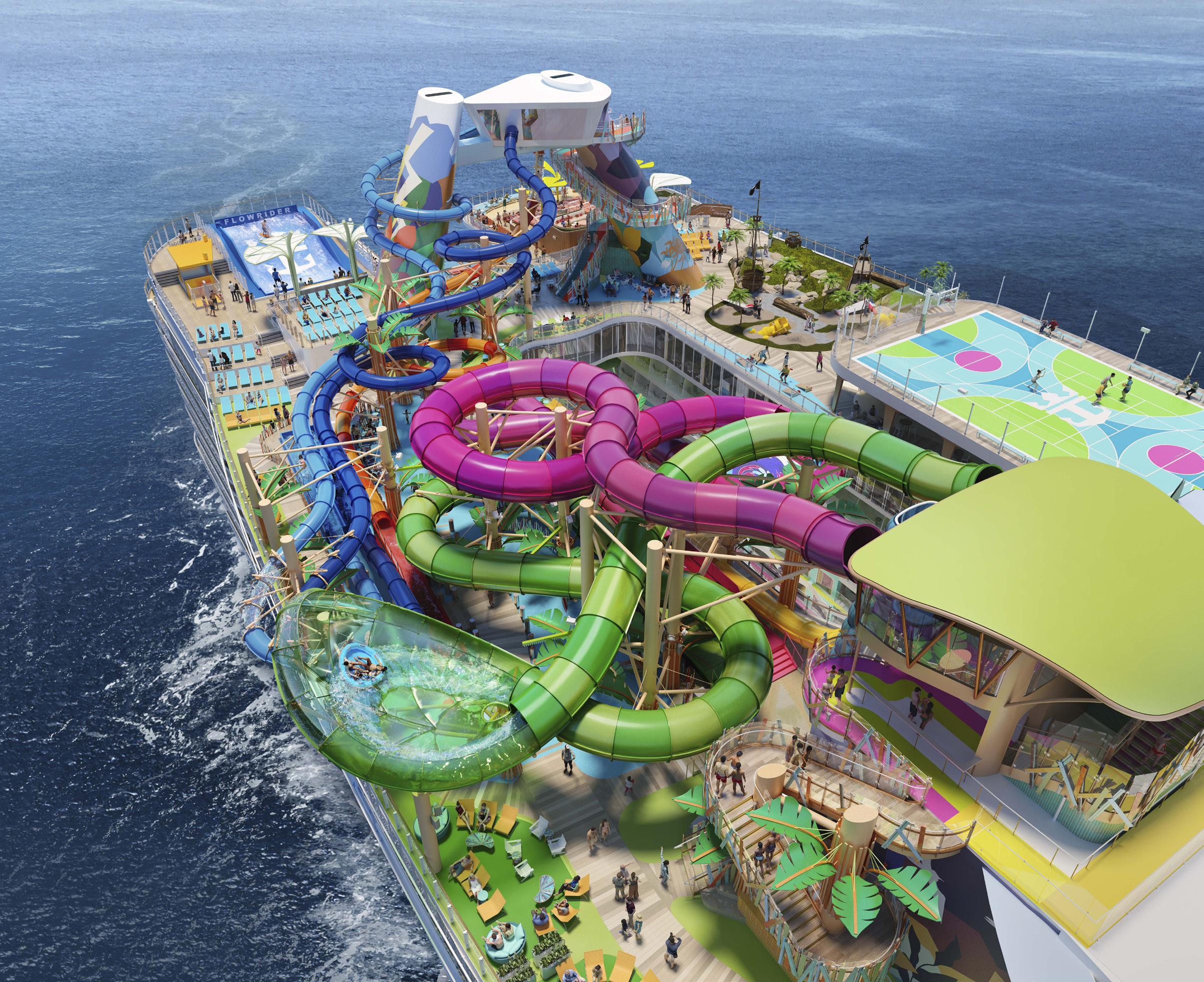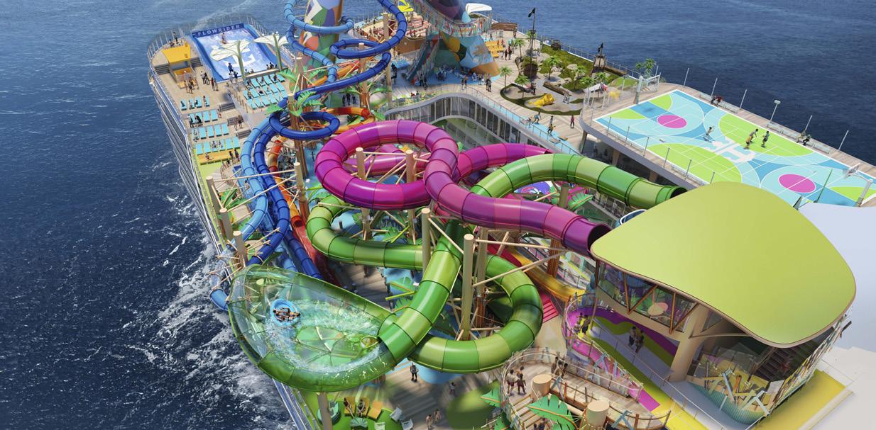 tes. La pieza de resistencia del barco será el parque acuático más grande del mundo en el mar. Catalogado como una embarcación hiper moderna de categoría 6, contará con seis toboganes que batirán récords, pero los huéspedes que deseen una experiencia más tranquila también podrán relajarse en las siete piscinas y nueve bañeras de hidromasaje con que cuenta el enorme barco.