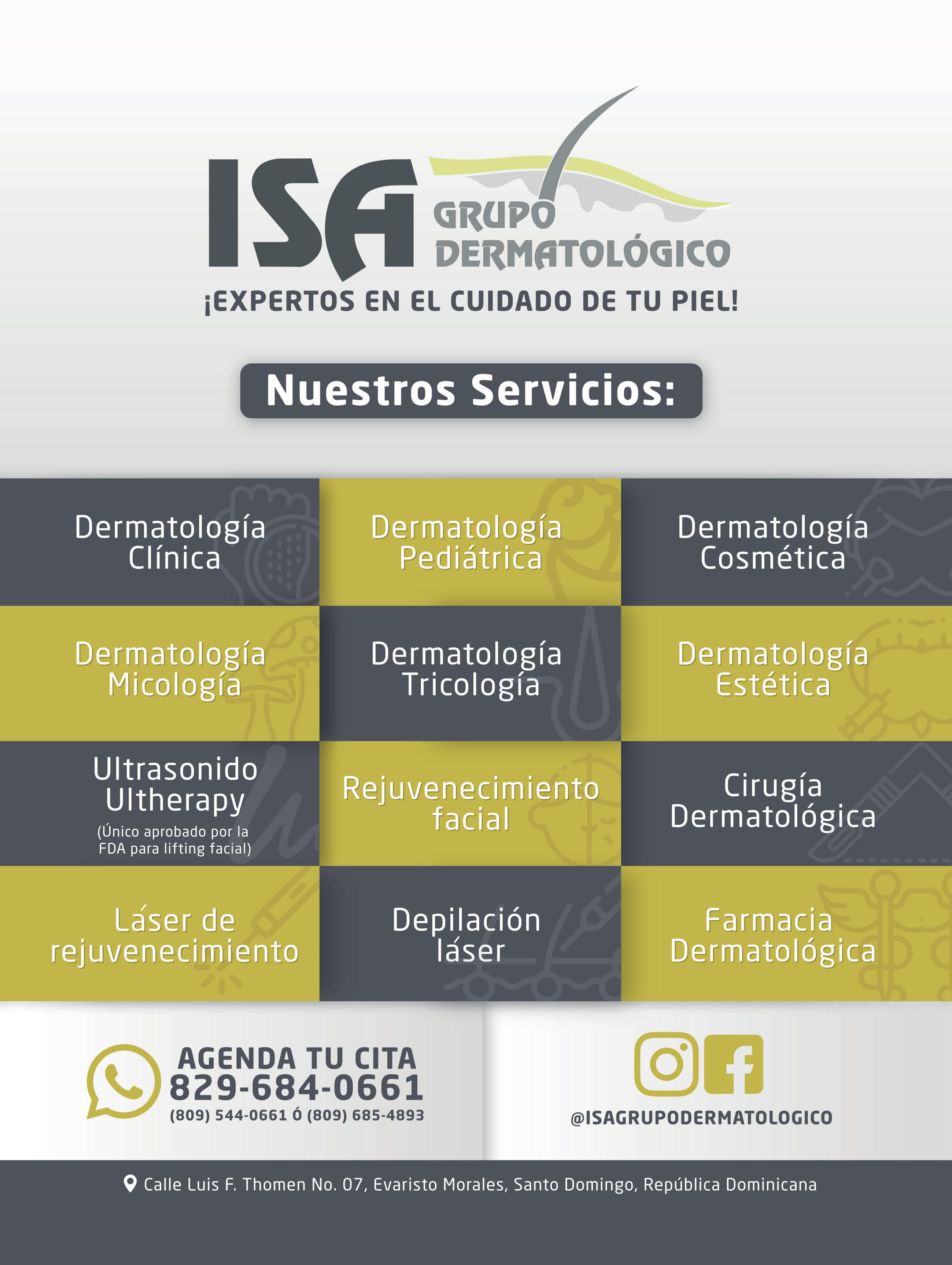 Isa Grupo Dermatológico es un centro especializado en el cuidado de las patologías y belleza de la piel, pelo y uñas, con una larga trayectoria orientada a la mejor atención de cada uno de sus pacientes. Durante más de 35 años en el mercado de servicios médicos, ofrecen una atención humanizada y personalizada, satisfaciendo todas las necesidades y expectativas, incorporando conocimientos actualizados y tecnología de vanguardia. El centro ha puesto la digitalización de sus procesos dentro de sus prioridades desde su fundación, logrando al día de hoy tener sistematizado toda la atención al paciente, mediante la adquisición e implementación de un sistema avalado por los principales organismos de salud a nivel mundial que permite tener de manera digital y en línea, todas las informaciones clínicas del paciente. Isa Grupo Dermatológico cuenta con un equipo de 10 dermatólogos y cirujanos dermatólogos altamente calificados, los cuales se mantienen en constante actualización y trazan las pautas de los tratamientos que brindan más beneficios, con la mayor seguridad. Como parte de su compromiso, Isa Grupo Dermatológico está en la constante