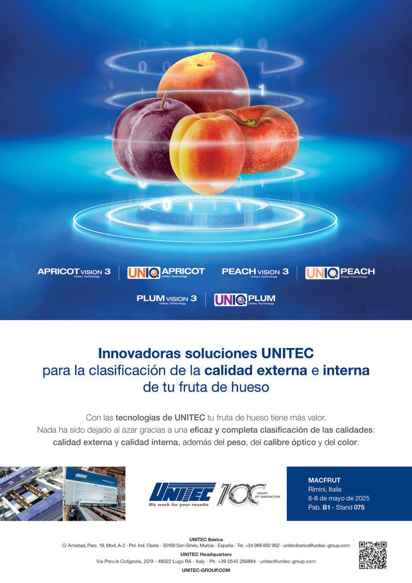 “Por medio de las soluciones tecnológicas de UNITEC, hoy en día logramos alcanzar la excelencia para la parte externa del fruto, pero simultáneamente la misión del Grupo UNITEC se centra principalmente en la parte interna. Hoy, las soluciones innovadoras de UNITEC son capaces de detectar el contenido de azúcar y reducir la incertidumbre en términos de Brix. Es posible clasificar los lotes de frutas y hortalizas, obteniendo una segmentación más precisa de la fruta para optimizar su comercialización”.