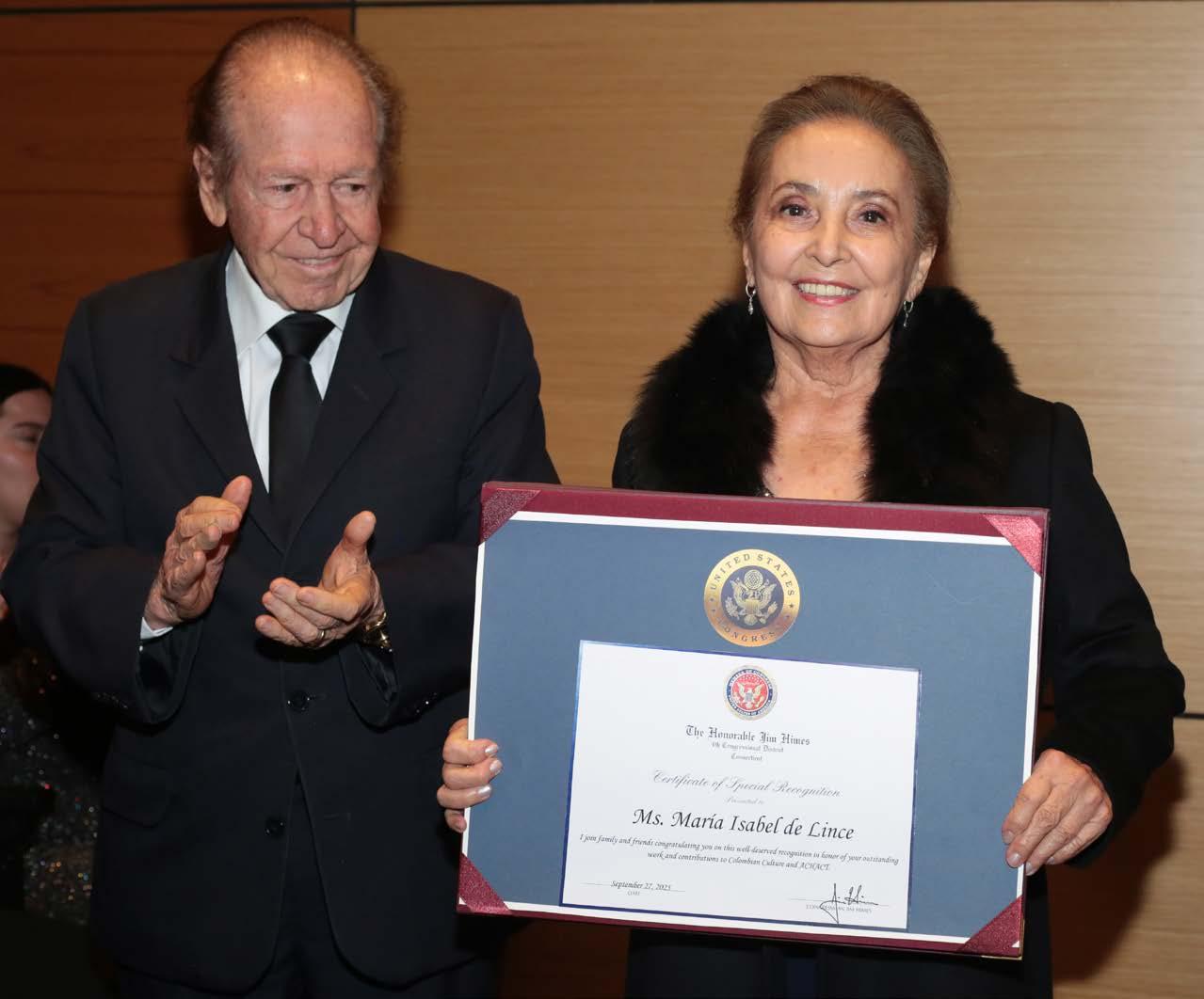 La artista María Isabel de Lince recibe la proclama enviada por el Senador de los Estados Unidos Jim Himes, en reconocimiento a su Trayectoria Artística.